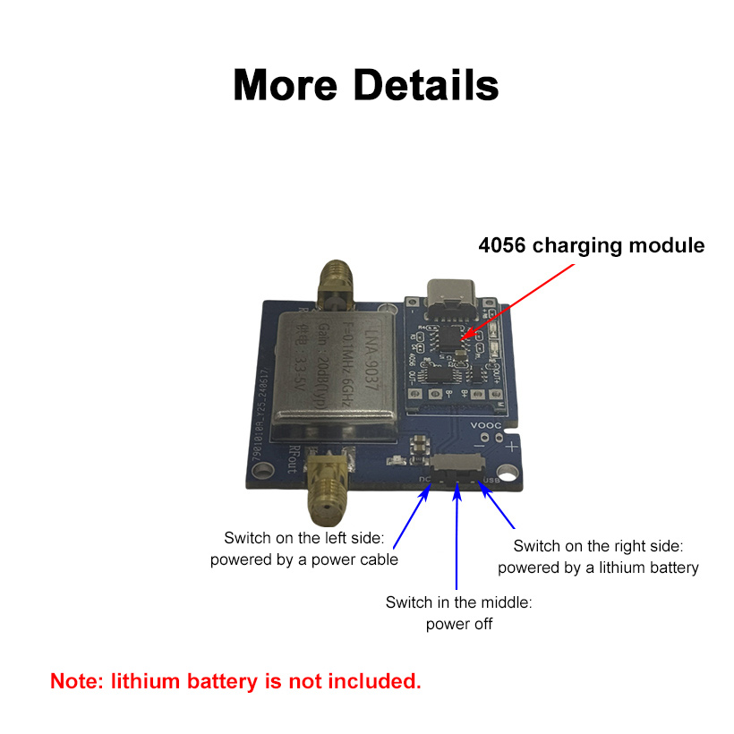The LNA amplifier uses a highly linear, ultra-low noise 9037 chip. The LNA module is designed for SDR MW, SW, radio FM and other frequency bands.