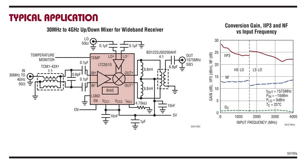 - Frequency: RF and L0 (1MHz to 6GHz), IF (1MHz to 500MHz, if you need higher frequency, you need to replace with a 4:1 output balun)