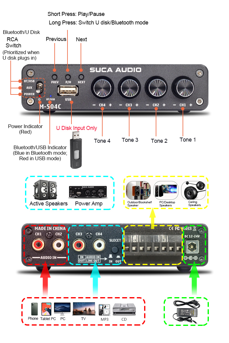 - Audio input: RCA/U disk/Bluetooth