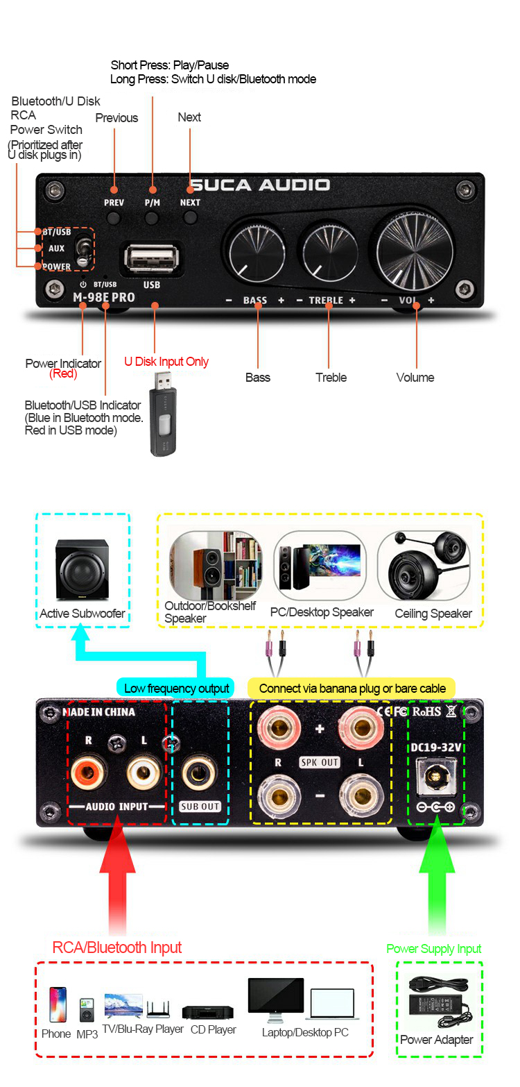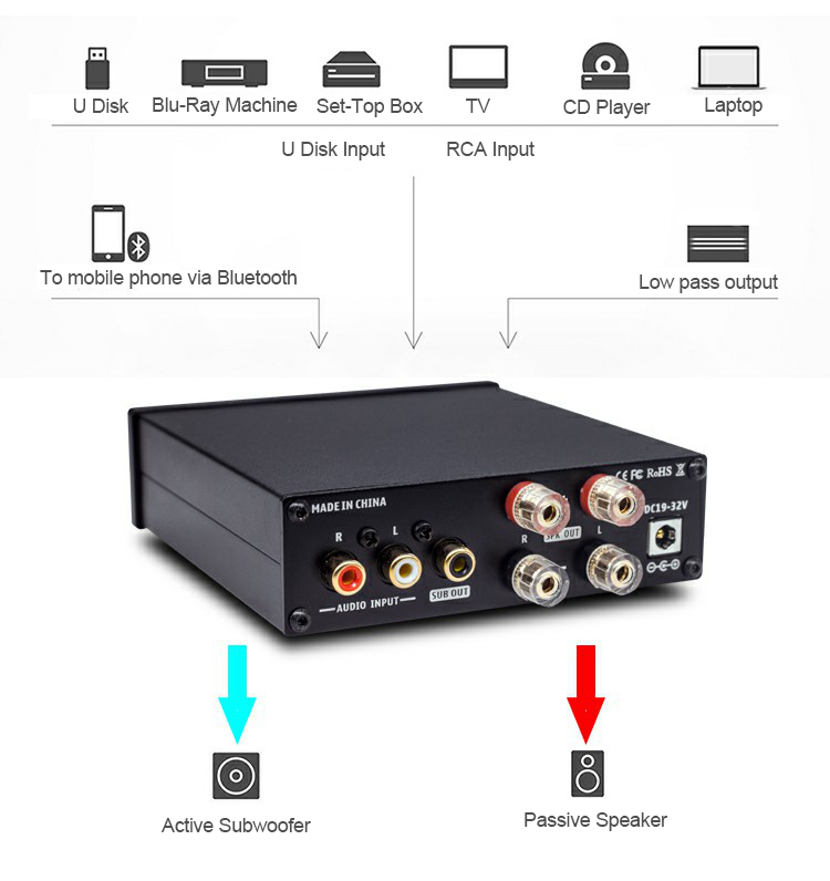 - New low-pass output: Can be used to connect active speakers to enhance bass effect. Treble and bass are adjusted separately to make sound more delicate and shocking. The auditory effect makes you feel like you are in a movie theater or a concert.
