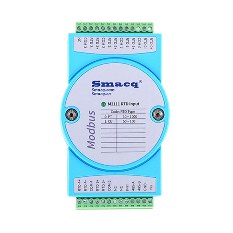 M2100 series temperature acquisition remote IO module is a set of computer interface modules based on the Modbus RTU standard protocol. M2100 is remotely controlled through the standard Modbus RTU protocol. The M2100 series is divided into two models. The M2101 is equipped with 8 input channels and is suitable for 8 types of thermocouples. M2111 is equipped with 6 input channels, which is suitable for PT and CU RTD. The resistance value of 0 degrees can be customized. The sensor type and sampling rate can be converted by program control.