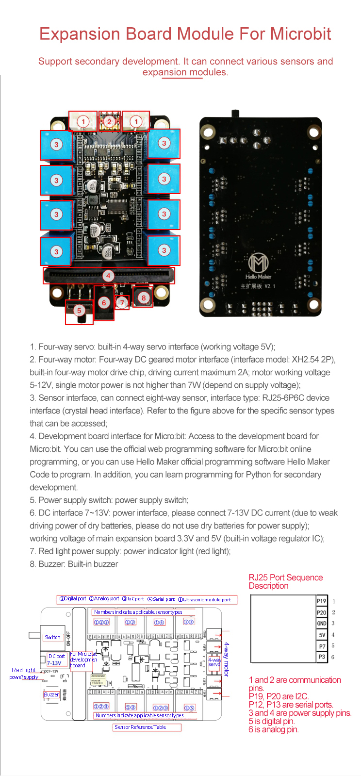- Programming software: Graphic programming software Hello Maker Code (offline version software based on editor for Micro:bit's Makecode) & programming for Python