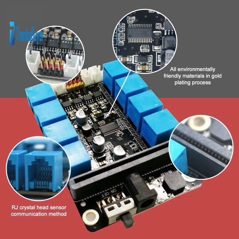 - Can be equipped with various sensors and electronic modules, such as potentiometer knob module, photosensor, touch sensor, IR obstacle avoidance sensor, tilt sensor, RGB light module, sound sensor, color gesture sensor, acceleration gyroscope sensor, flame sensor, tracking sensor, Hall balance sensor, ultrasonic sensor.