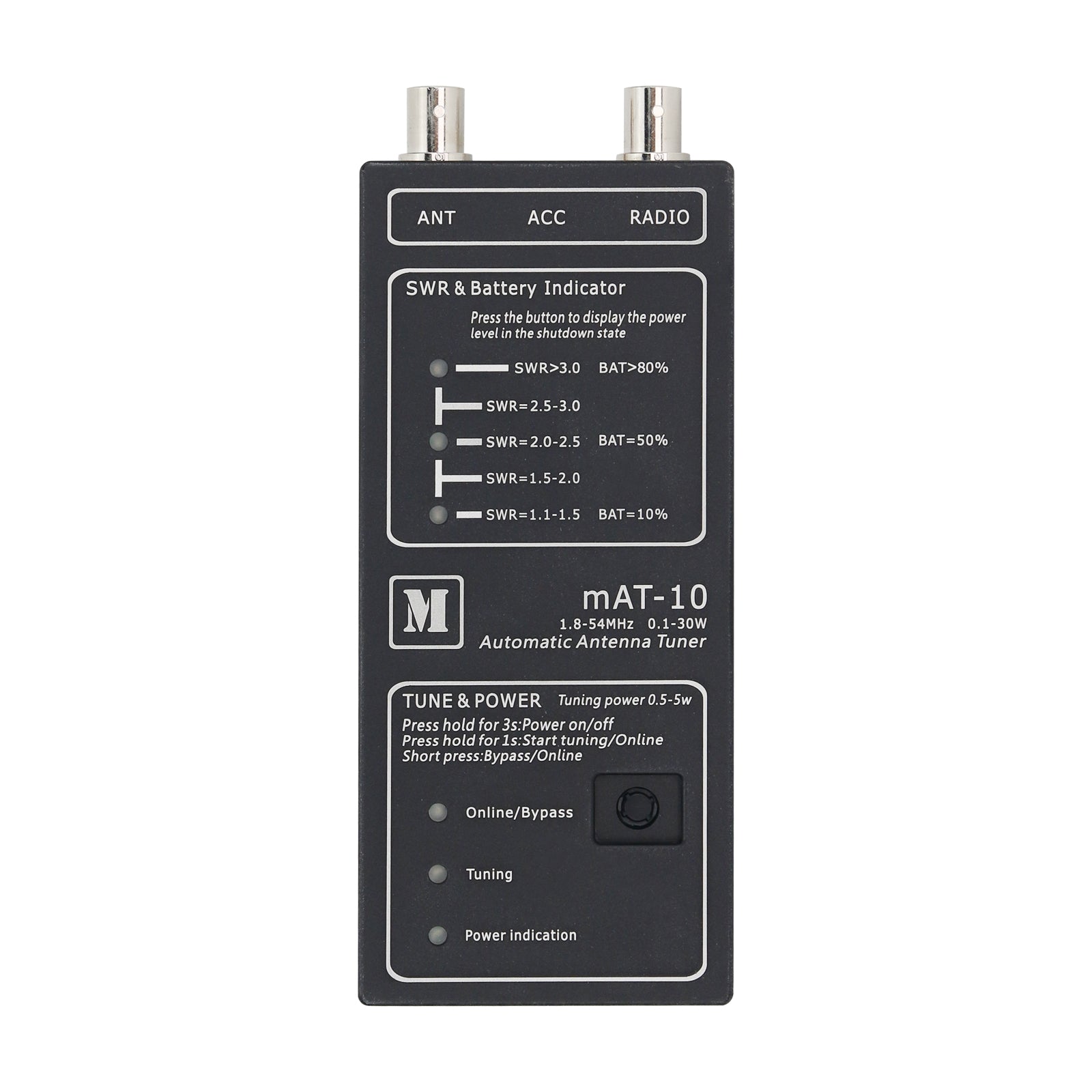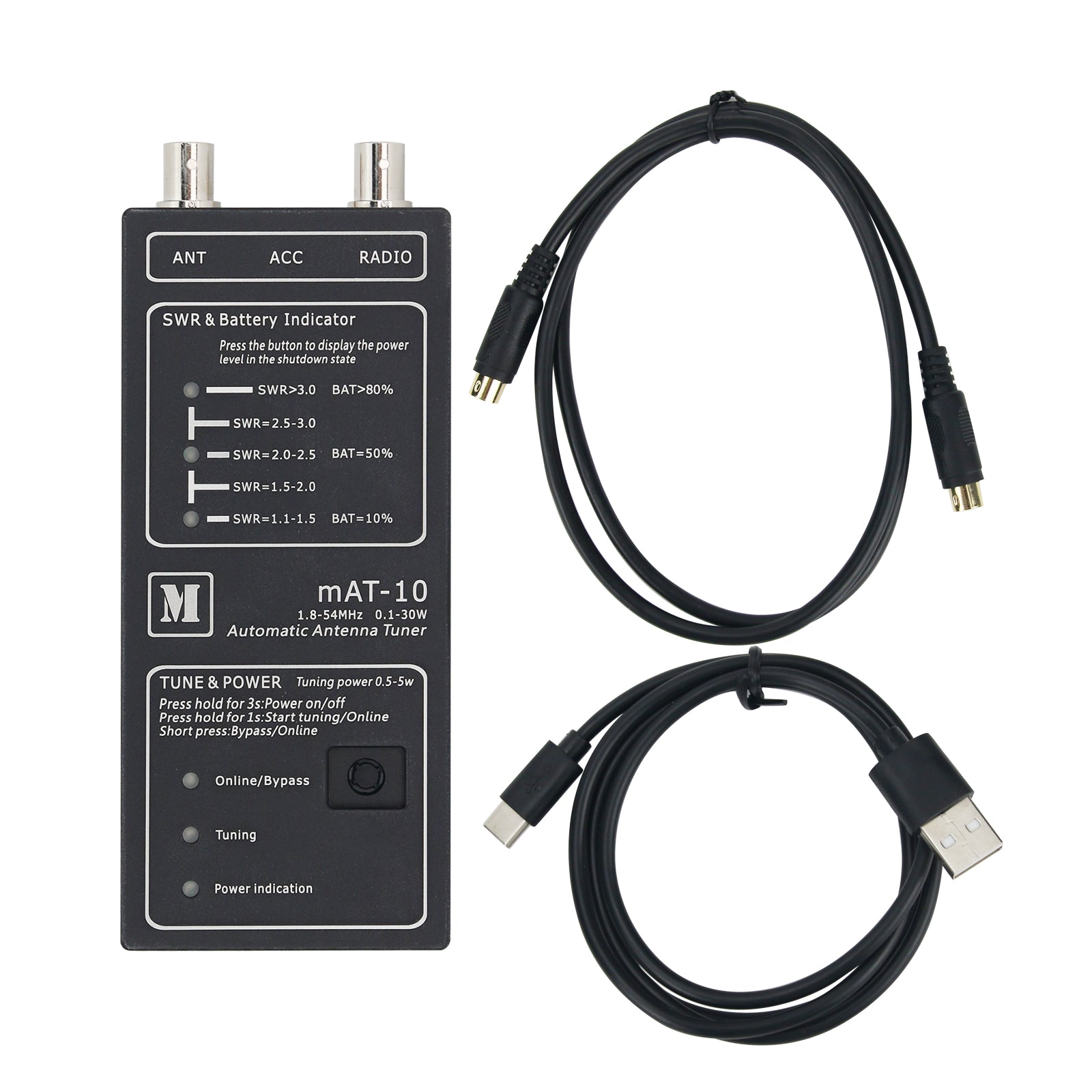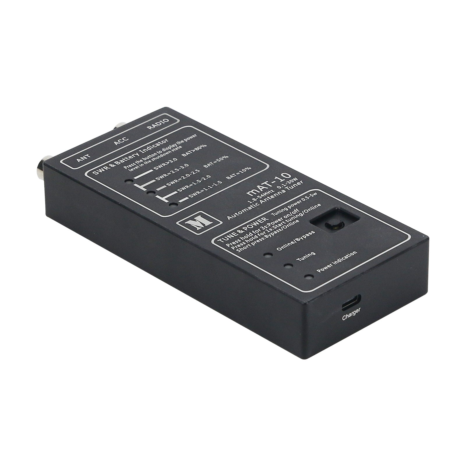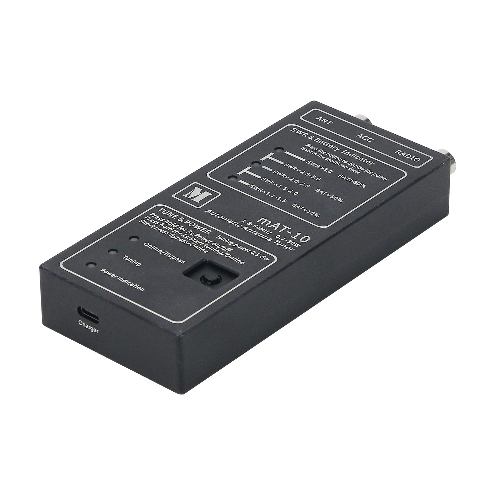 The mAT-10 is a dedicated automatic antenna tuner designed for the Yaesu FT-817/818 series. It features an internal power system with two built-in 10440 lithium batteries, providing long standby time on a single charge. Before first use, ensure the batteries are fully charged. Weighing only 300g, the tuner is compact and lightweight, and it also includes a Type-C charging port for convenient recharging.