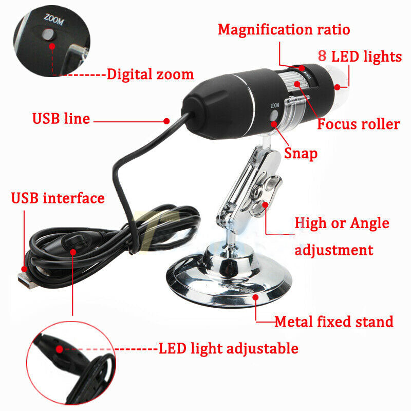 This microscope lets you experience the thrill and discovery of a whole new microscopic world- totally hidden from the naked eye.which can magnify objects up to 1000 times of their original size and uses a dynamic image sensor and eight super bright white LED lights for creating detailed images like you've never seen before. This allows you to see even the smallest of details, in high resolution, directly on your computer screen. Details like skin pores, individual strands of cotton, the milky or amber clouds inside crystals or even the fine scratches on a collectible coin that would be impossible to detect with the naked eye, can easily be viewed by this amazing USB digital microscope. With the included software you can even save your images directly to your hard drive in JPG or video files for sharing with your friends, family, boss or client. There is even a handy zoom and photo button on the side for your convenience. If you're a professional user then you'll be happy to know that this software will even display a measurement scale to determine the exact size of the objects you are viewing for accurate appraisals or damage assessment.
