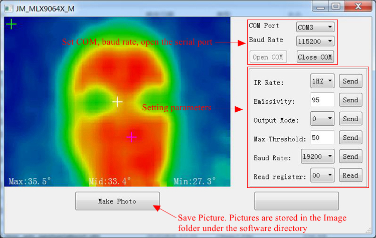 - Multiple output modes: automatic output of 768 points of temperature, output of the highest and lowest temperature, PWM alarm output