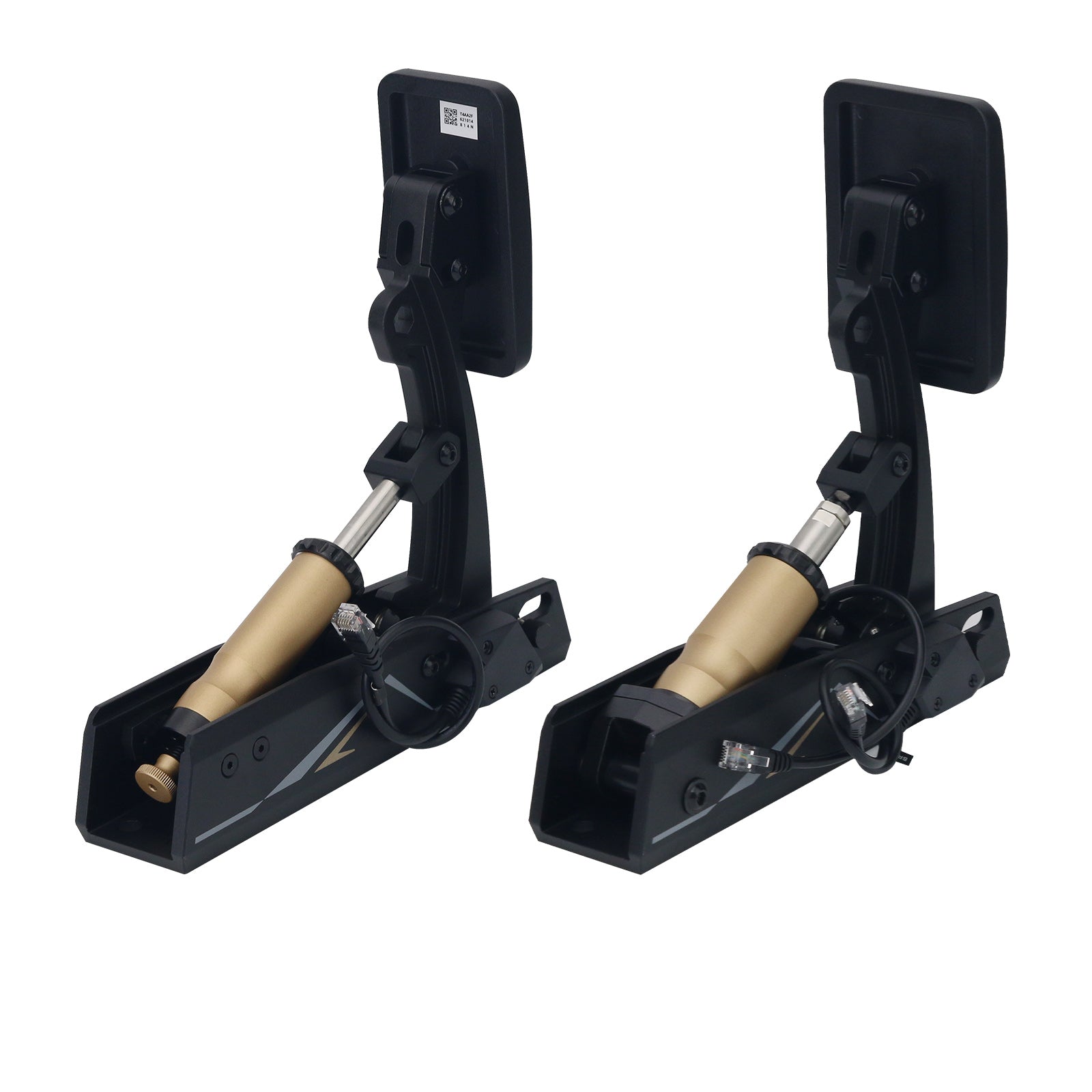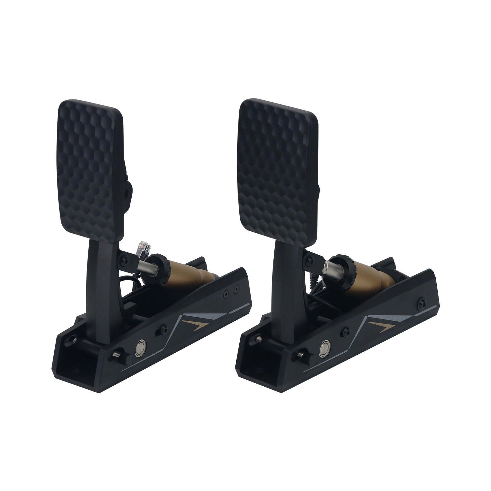 * Minimalist Design: The CRP2 sim racing pedals feature a minimalist design with smooth curves and a sophisticated black-and-gold color scheme that exudes competitive energy. Hexagonal design elements on the pedal face symbolize stability, balance, and versatility. Concealed wiring, springs, and screws contribute to a clean, professional appearance.