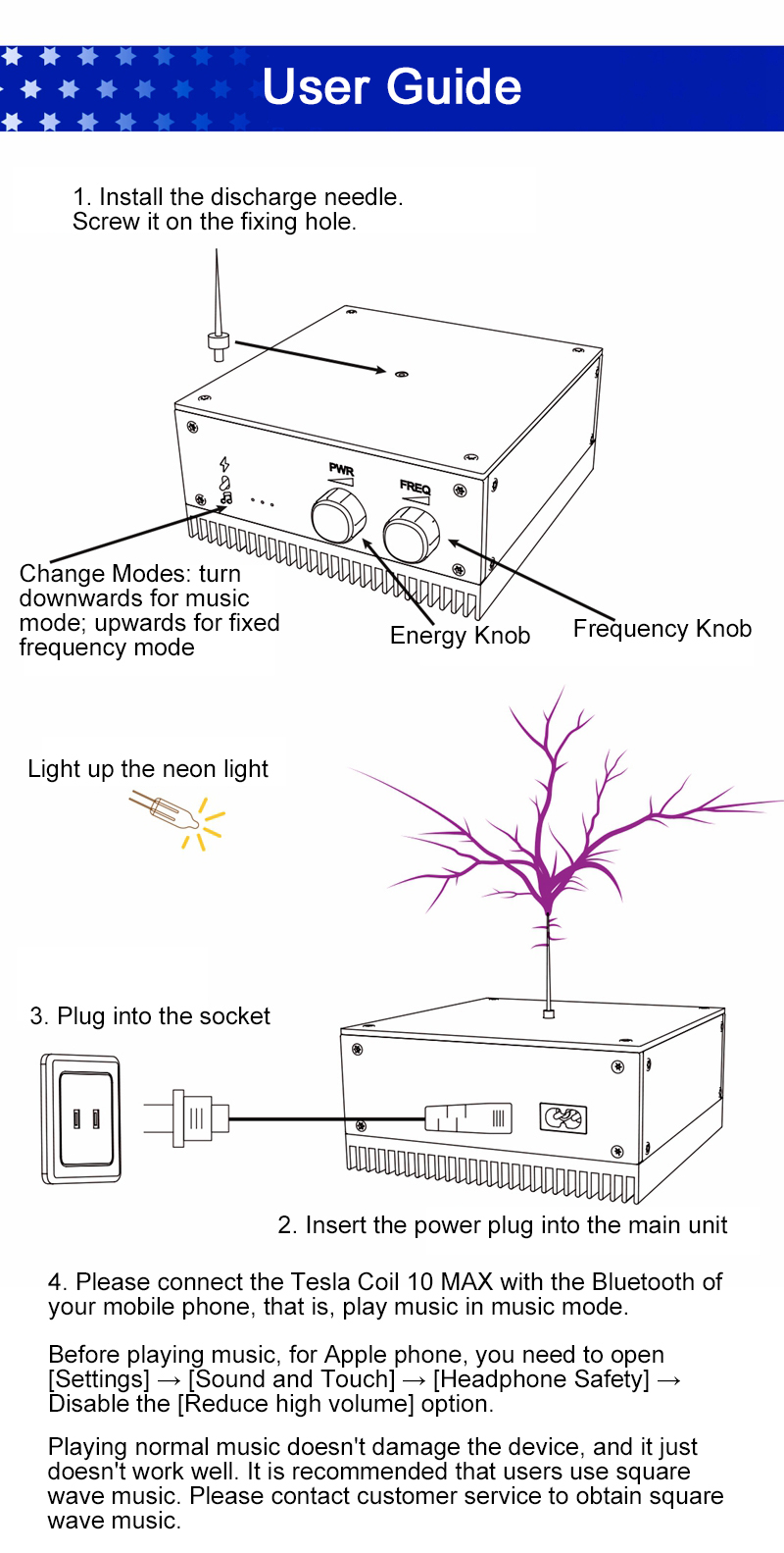 Answer: This product can work in long arc mode and in music mode. It is recommended to use square wave music, ordinary music is not good (square wave music can be obtained by contacting customer service). # Square wave music is a special music format, which is processed by software from ordinary music. It has a strong sense of rhythm and is suitable for Tesla coil to play.