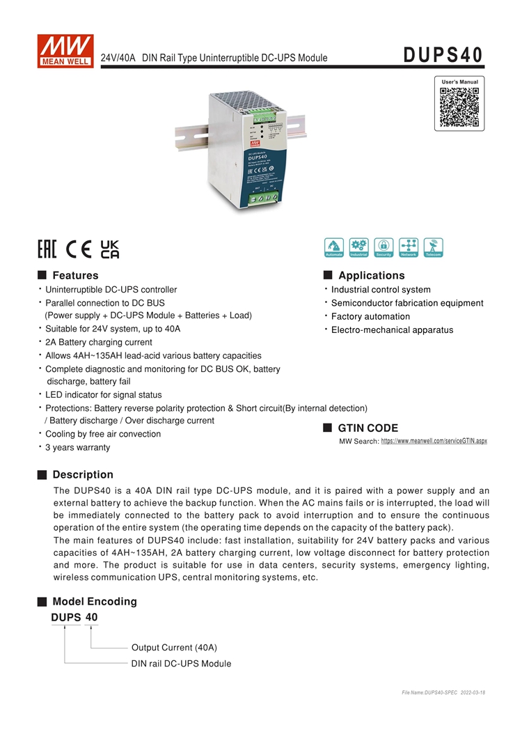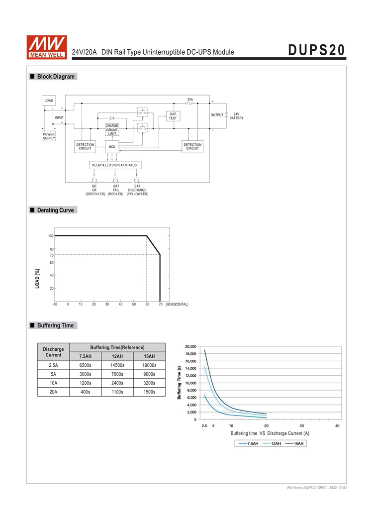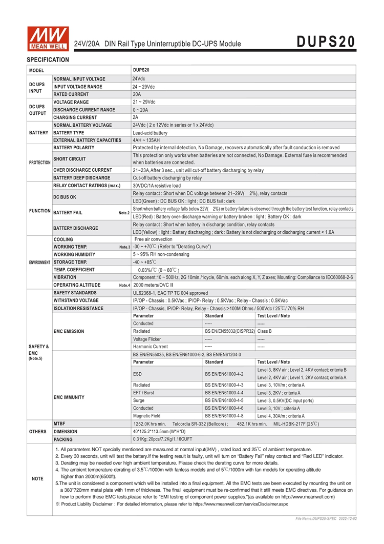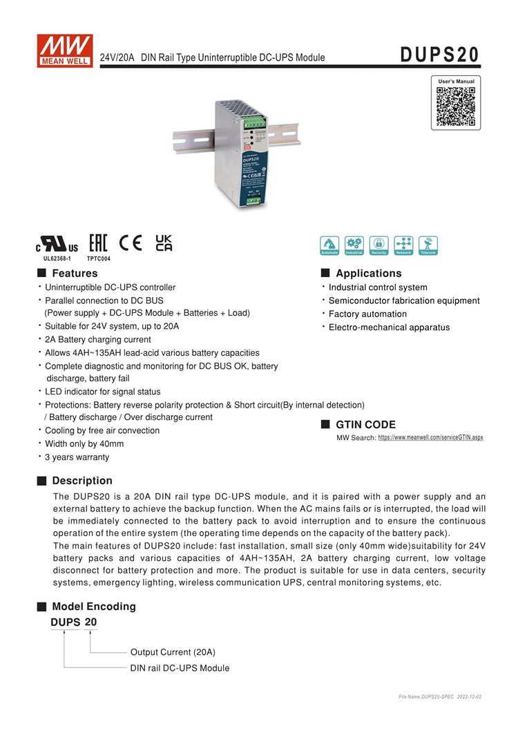 - The DUPS20 is a 20A DIN rail type DC-UPS module, and it is paired with a power supply and an external battery to achieve the backup function. When the AC mains fails or is interrupted, the load will be immediately connected to the battery pack to avoid interruption and to ensure the continuous operation of the entire system (the operating time depends on the capacity of the battery pack).