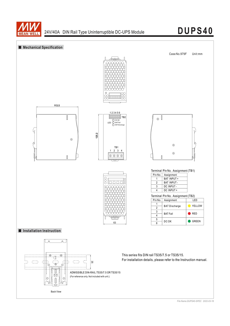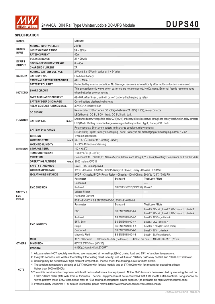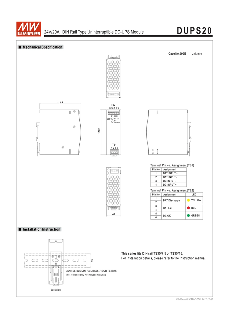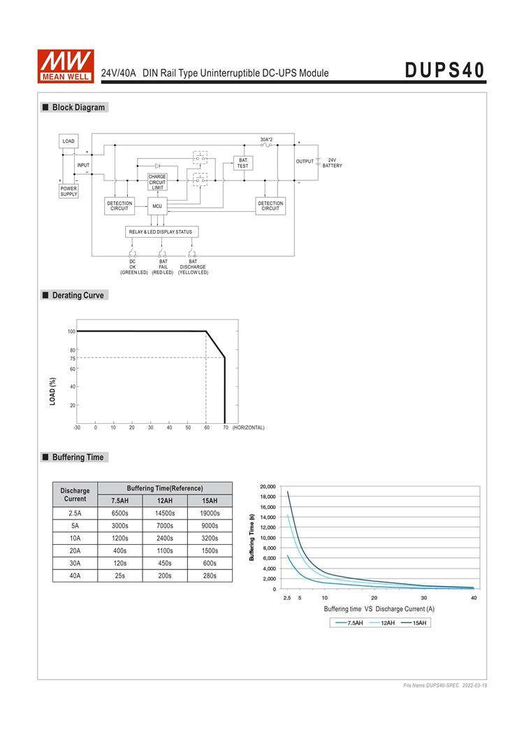 - The DUPS20 is a 20A DIN rail type DC-UPS module, and it is paired with a power supply and an external battery to achieve the backup function. When the AC mains fails or is interrupted, the load will be immediately connected to the battery pack to avoid interruption and to ensure the continuous operation of the entire system (the operating time depends on the capacity of the battery pack).