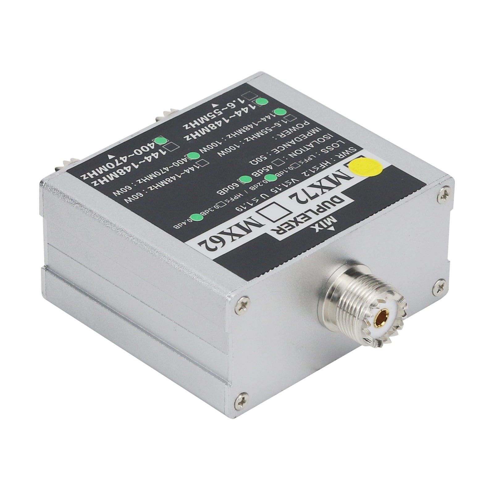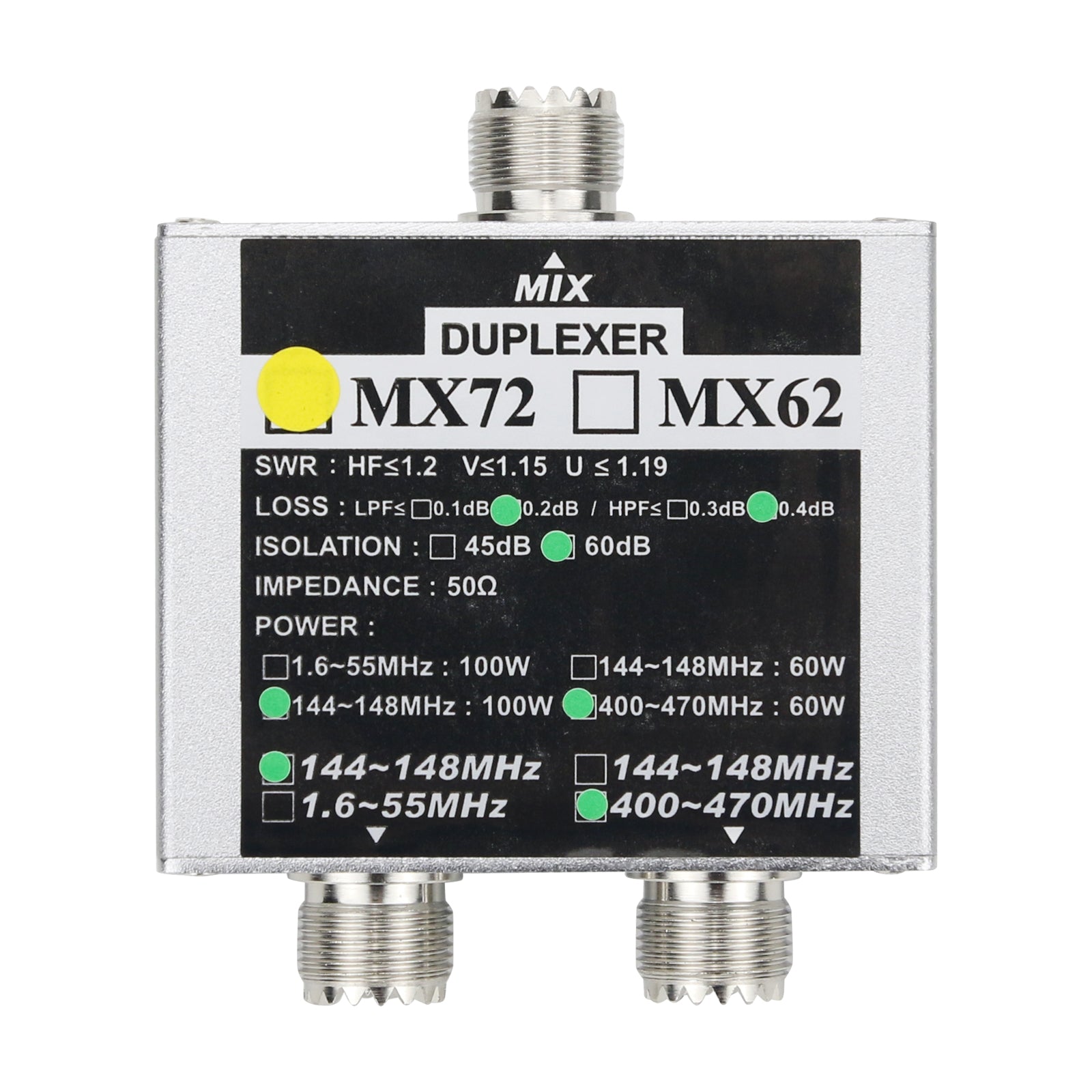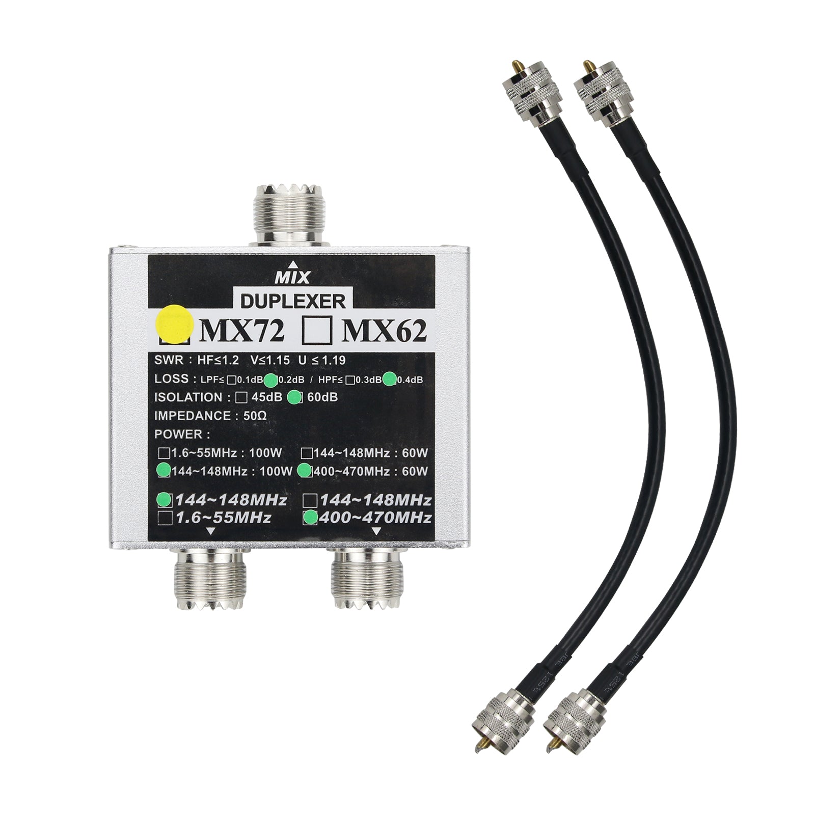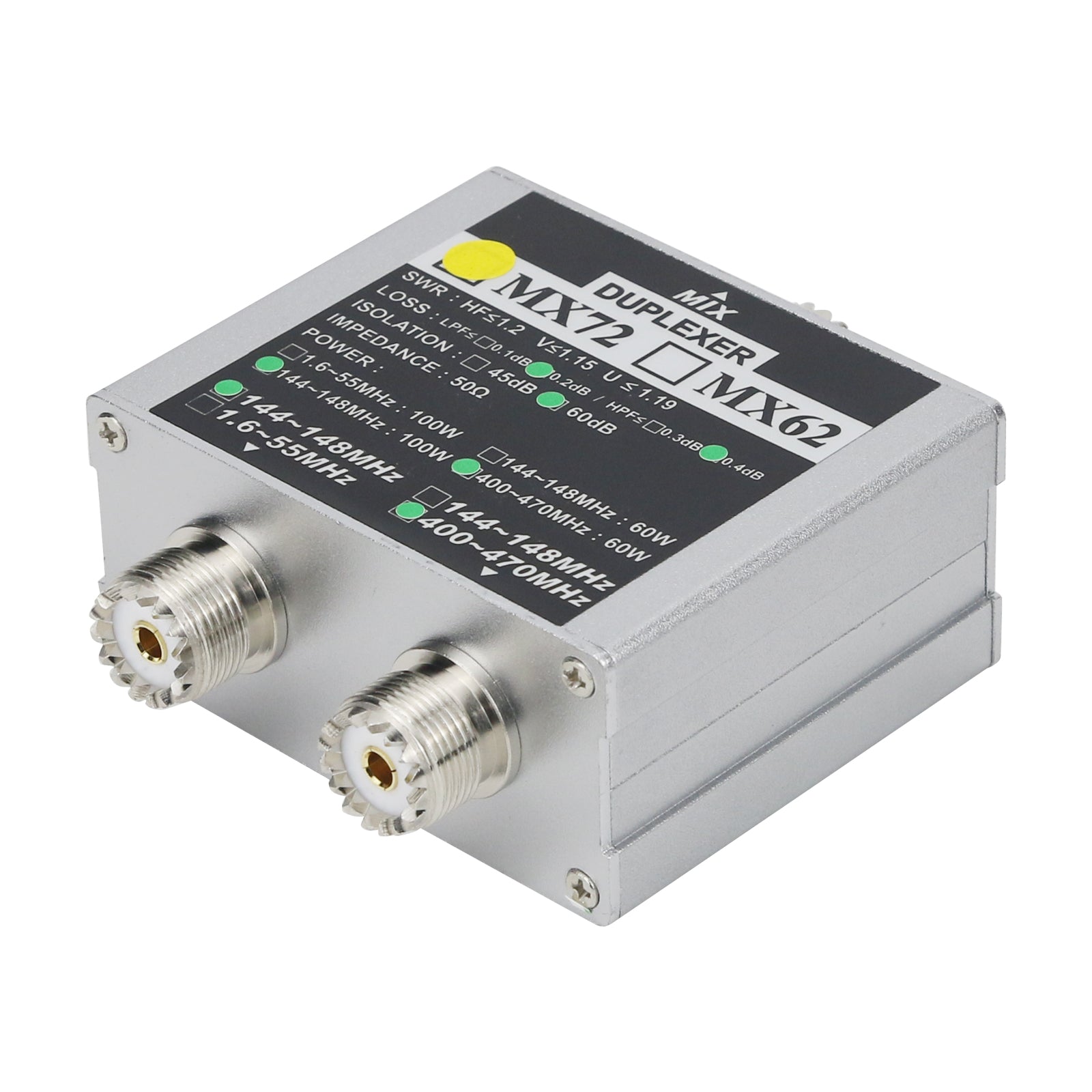 - Insertion loss: 144~148MHz: ≤0.2dB; 400~470MHz: ≤0.4dB