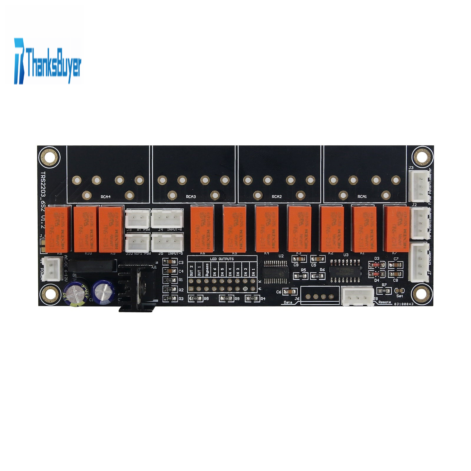 1. 6-channel RCA audio source signal input selection, two of which have built-in interfaces, and two sets of power switches are connected in parallel. For example, if the switchboard is installed with a built-in audio source (such as a Bluetooth audio module), you can directly connect the audio of this module to the built-in interface of the switchboard, and then turn the power on and off through the linked relay control. When this input is selected, the power of this audio source (such as Bluetooth audio module) is automatically turned on.