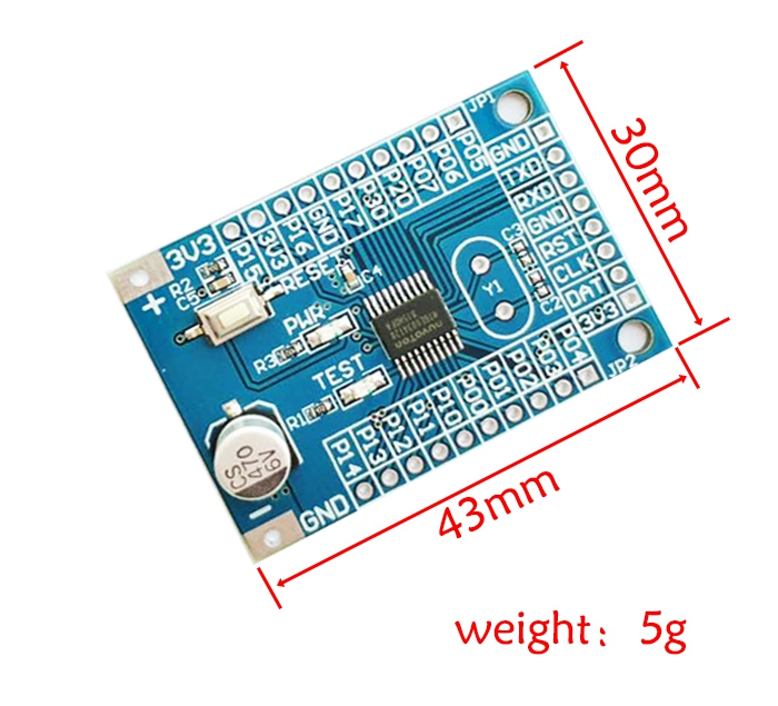 STM8S003F3P6: a total of 20 pins, supporting up to 16 GPIOs and 16 external interrupts. 2pcs 16-bit timers [TIM1 / TIM2] can output up to 3 PWM signals. 5 ADC channels support SPI / I2C / UART. 8KBYTE FLASH, 1K RAM, 128 BYTE EEPROM. With built-in 16M high-speed oscillator, WDG and so on.
