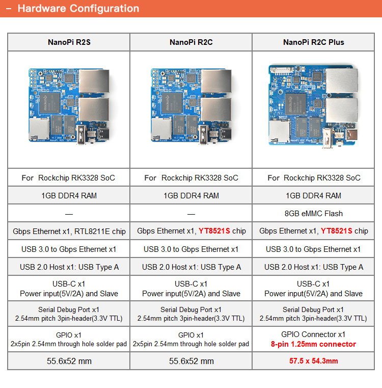 NanoPi R2C Plus is a fully open source edge computing router with ultra-miniature dual Gigabit Ethernet ports. It boasts a size of only 63.5 x 63.5mm/2.5 x 2.5" (including metal casing).