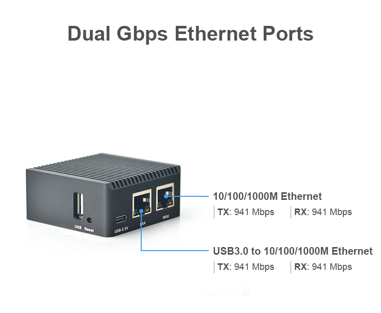 - Dual Gbps Ethernet Ports: NanoPi R2S has two Gigabit Ethernet ports, one is directly derived from SoC, the other is transferred by USB3.0. The transmission rate of Gigabit Ethernet port directly derived from NanoPi R2S is 941Mbps, and the receiving rate is 941Mbps; The transmission rate of the transferred Gigabit Ethernet port is 941Mbps, and the receiving rate is 941Mbps.