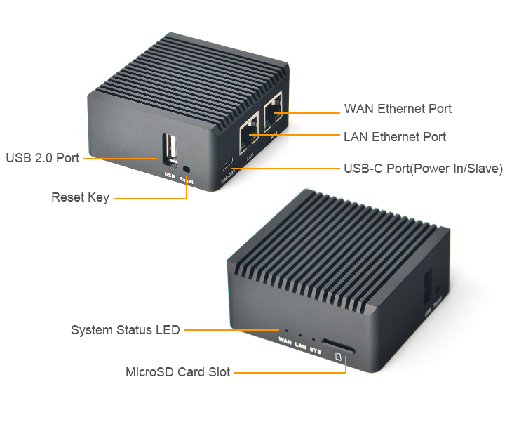 NanoPi R2S supports TF card boot operating system, supports for FriendlyWrt, Ubuntu Core and third-party systems such as Armbian, and has a good software ecosystem. Now the official mainline for OpenWrt also supports NanoPi R2S. These systems are based on long-term support for kernel Linux-5.4(LTS). NanoPi R2S uses a universal Type-C interface for power supply, which is very suitable for high-speed and high-performance network applications with limited space.