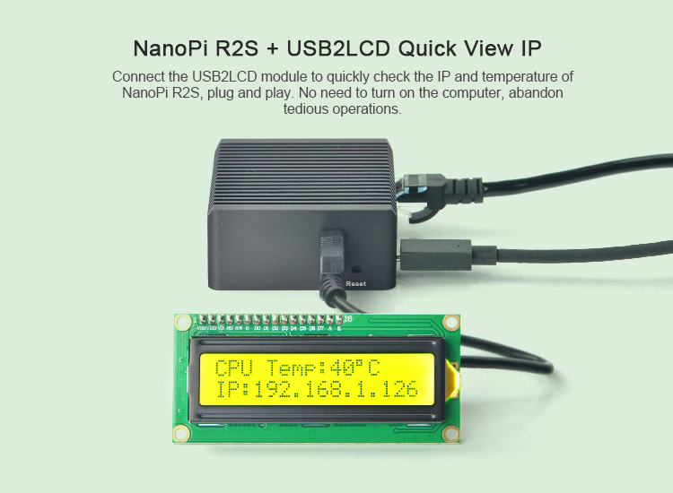 - NanoPi R2S + USB2LCD Quick View IP: Connect USB2LCD module to quickly check the IP and temperature of NanoPi R2S, plug and play. No need to turn on computer, avoid tedious operations.