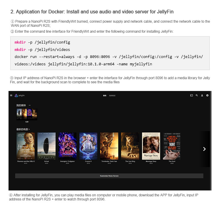 6. How to use video server for JellyFin on NanoPi R2S through Docker http://wiki.friendlyarm.com/wiki/index.php/How_to_setup_JellyFin_media_system_on_NanoPi-R2S/zh