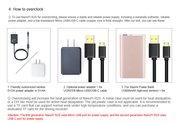 Before using your NanoPi R2S, please get the following items ready. 5V 2A charging head (quick charge forbidden), USB-C cable, C10-TF card (firmware and card making tutorial will be mentioned later).