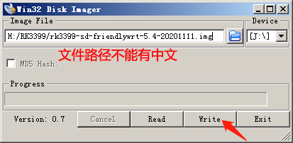 2. Flash to TF card: Unzip the downloaded system firmware and the flashing tool win32diskimager.rar separately, insert a TF card for Windows (only 4G and above Class10 cards), right-click to run the flashing tool win32diskimager as an administrator. And on the interface of the flashing tool win32diskimager, select your TF card drive letter (you must choose the right drive letter, otherwise there is a risk of formatting other mobile hard drives), select the system firmware you want to burn, and click the Write button to burn.