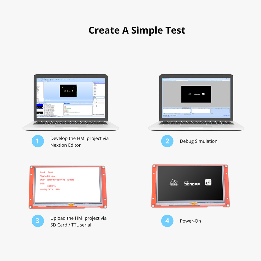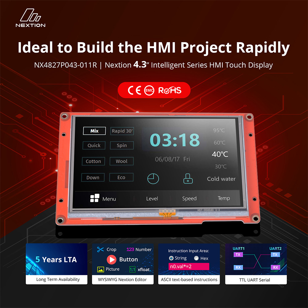 Nextion Editor is a free human-machine interface (HMI) GUI development software for Nextion Basic Series, Enhanced Series, and Intelligent Series. The software offers an easy way to create an intuitive and superb touch user interface even for beginners. Add a static picture as a background, define functions by components, you can make a simple GUI in minutes. The easy Drag-and-Drop components and simple ASCII text-based instructions will dramatically reduce your HMI project development workloads and develop projects rapidly in a cost-effective way. The Nextion product is the best balance HMI solution between cost and benefit with a low and decreased learning curve.
