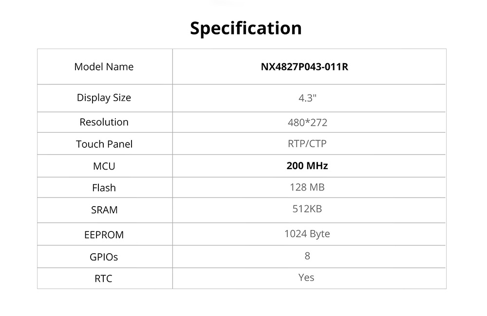 NX4827P043-011R is a Nextion Intelligent series 4.3'' resistive HMI touchscreen without enclosure.