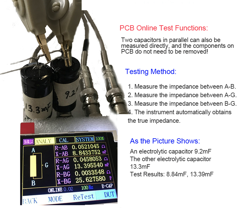 - It can measure the internal resistance of the battery. (It is necessary to connect a capacitor in series to cut off the DC voltage. The capacitor is connected in series with the battery. Since the capacity of the battery is large, the entire capacity after connection is approximately equal to the capacity of the Electrolytic capacitor.)