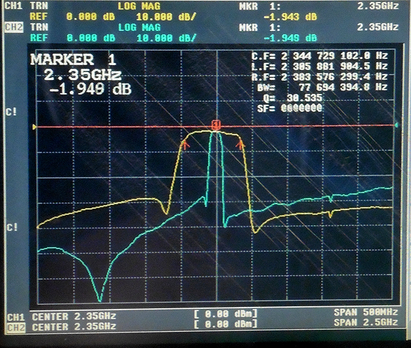 The filter is a surface acoustic wave filter with a bandwidth of 50MHz and a steep cut-off characteristic. It is used to optimize the performance of 2.4GHz (2350MHz, 2370MHz, etc.) receivers, etc. In addition, it effectively filters out out-of-band signals, reduces noise, and increases dynamic range.