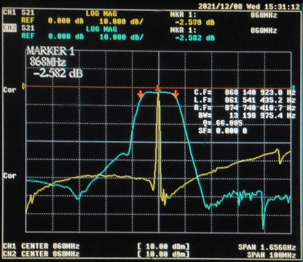 This filter has a 1dB bandwidth of 4MHz and a steep cut-off characteristic. It is used to optimize the performance of 868MHz RFID receivers and European standard LoRa IoT node devices. In addition, it can effectively filter out-of-band signals, reduce noise, and increase dynamic range.