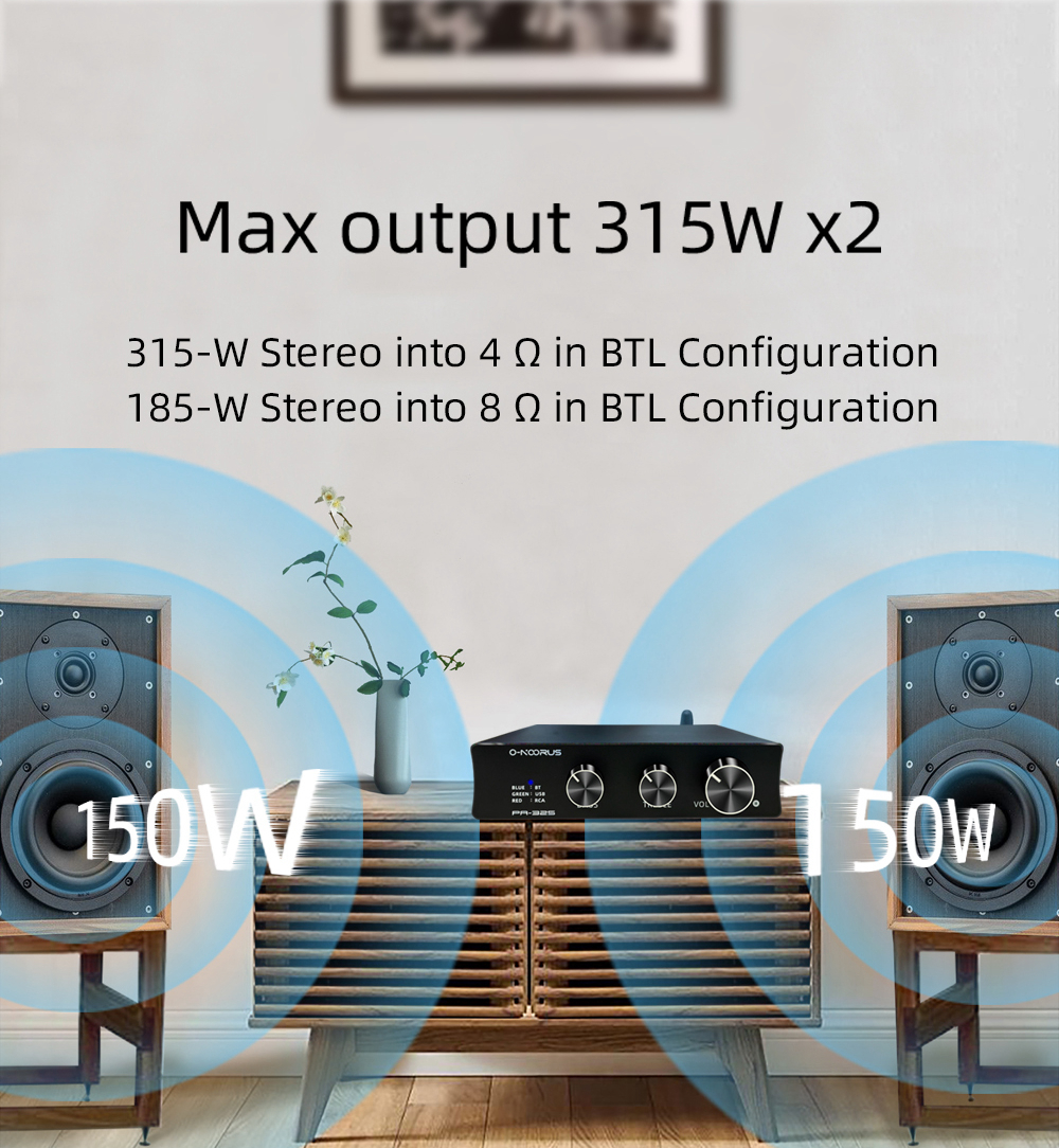 - TPA3255, power up to 150Wx2 (4Ω 24V power supply)