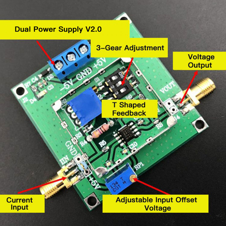 - TIA trans-impedance weak current measurement module; IV conversion preamplifier, pA-nA-mA for silicon light detection.