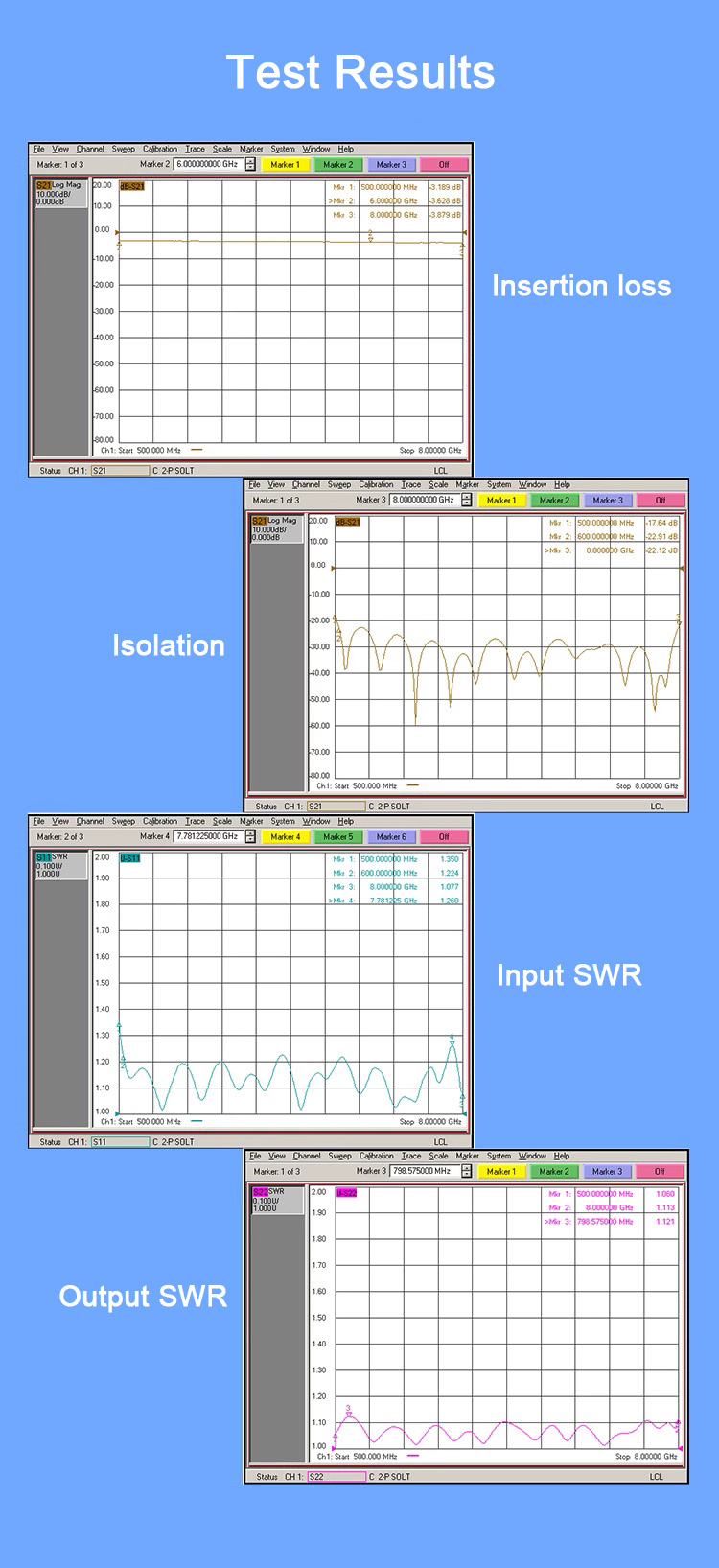- Isolation: Typical: 18dB and Minimum: 17dB at 0.5-0.6GHz; Typical: 22dB and Minimum: 20dB at 0.6-8GHz