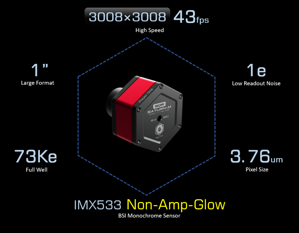 Saturn-M SQR (IMX533) camera is developed by Player One Astronomy, SQR means its sensor is square. Saturn-M SQR camera, which adopts original IMX533 1" square format monochrome sensor for Sony. The 3.76um pixel size accommodates a well depth of 73Ke with a total of 9MP (the resolution is 3008*3008), and the diagonal is 16mm.
