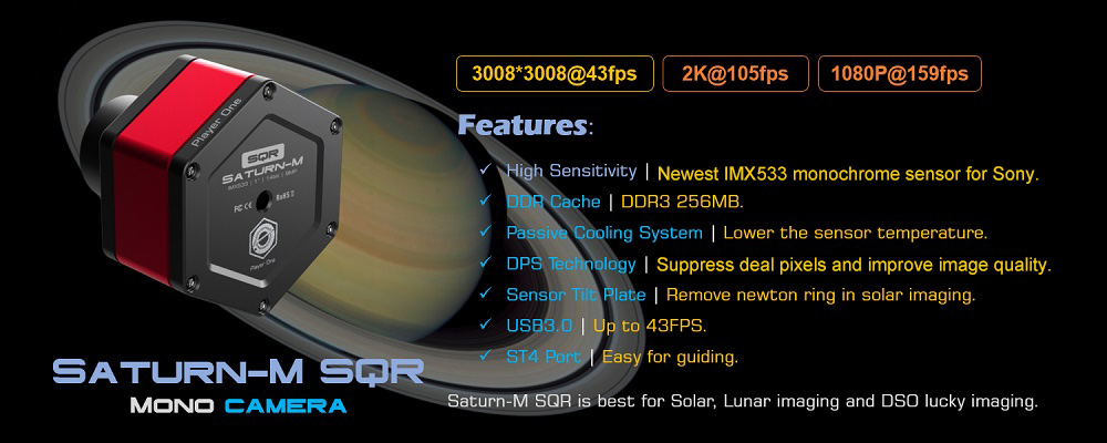 Saturn-M SQR and Saturn-C SQR is the most powerful planetary camera in our history! Based on IMX533 BSI sensor, high image quality, high resolution and square format, non-amp-glow feature, the camera will be great for lunar, solar mosaic and DSO lucky imaging.