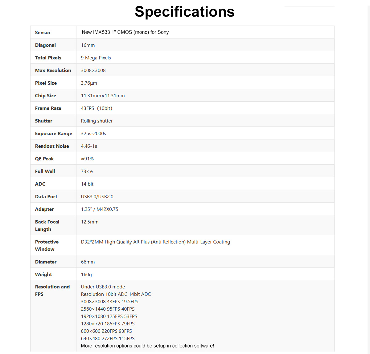 Based on our technology, we improved the full well of Saturn-M SQR camera to 73Ke. It's almost 1.5 times than IMX533 Basic (50ke).