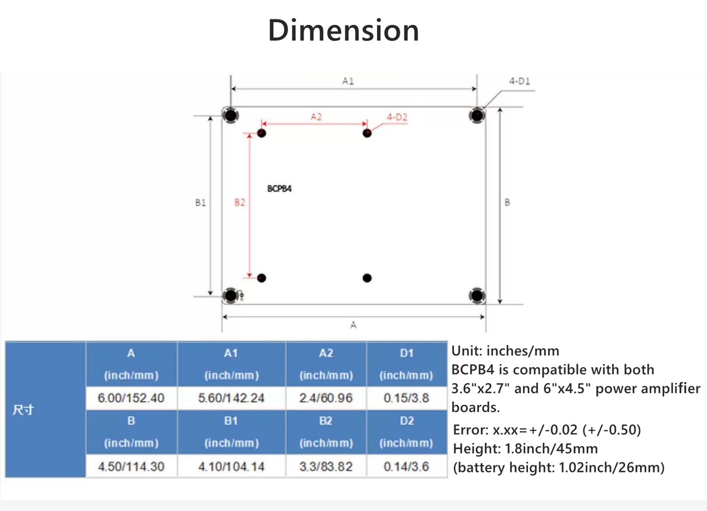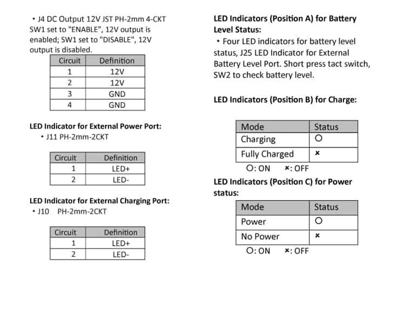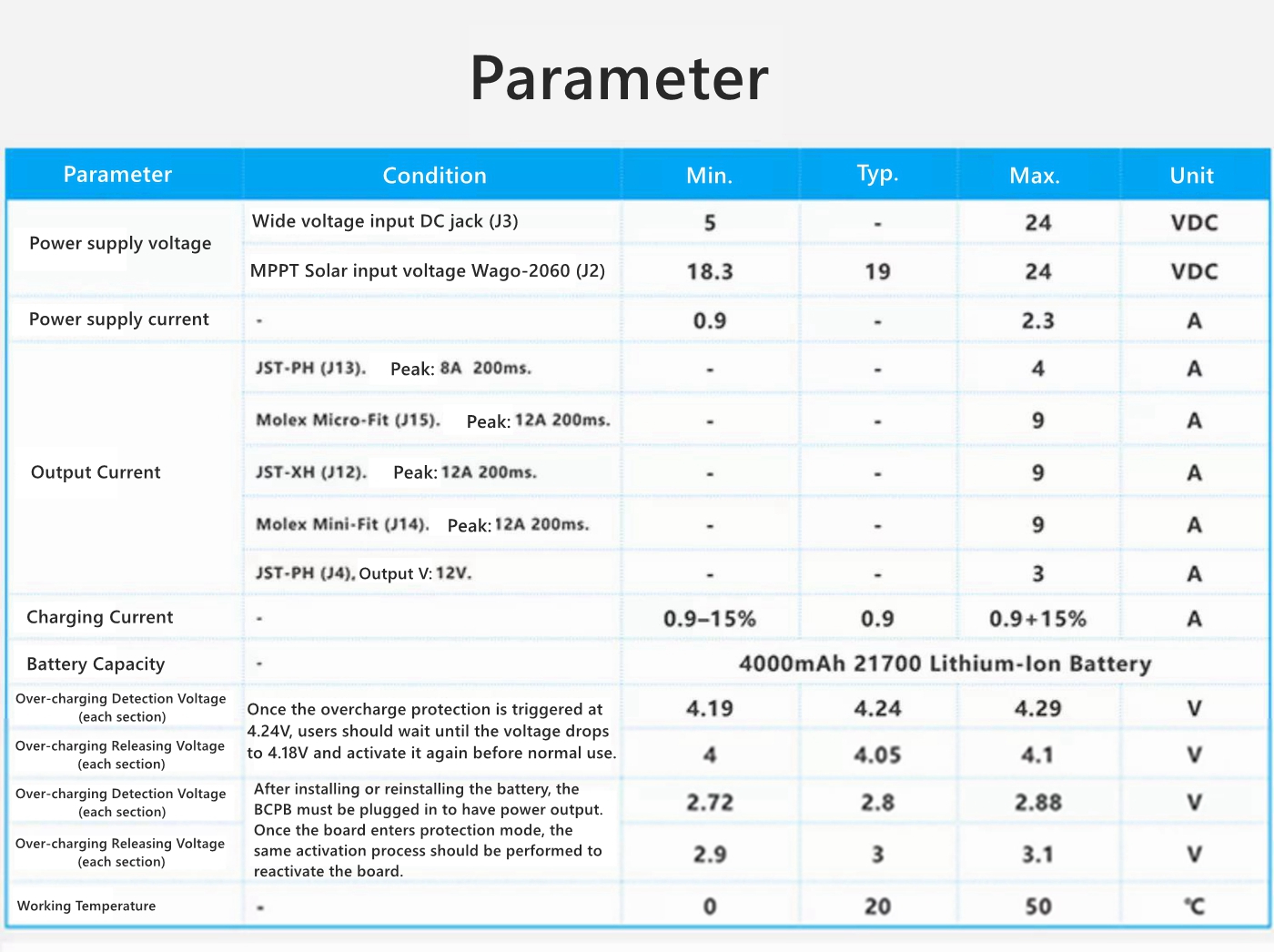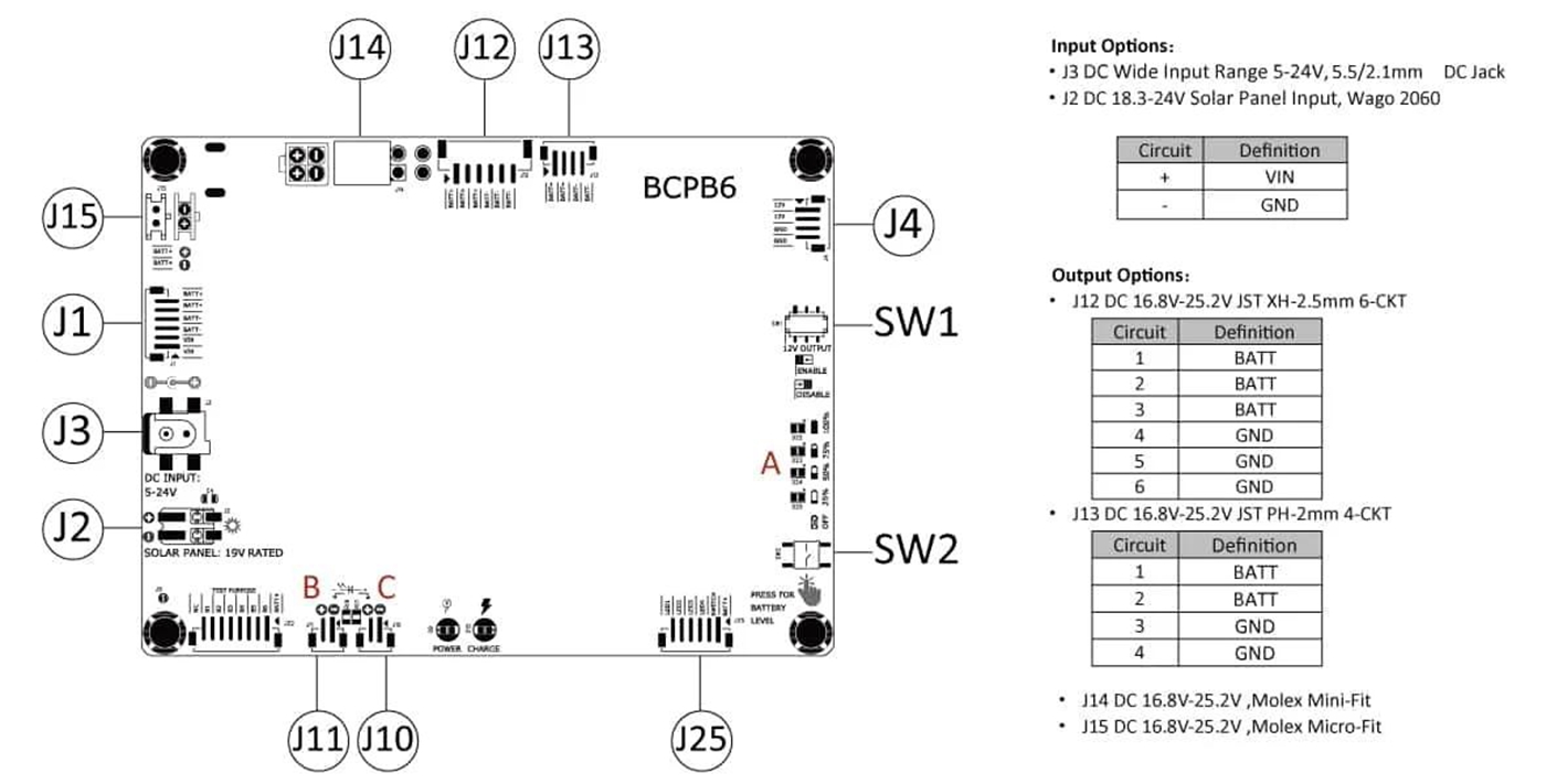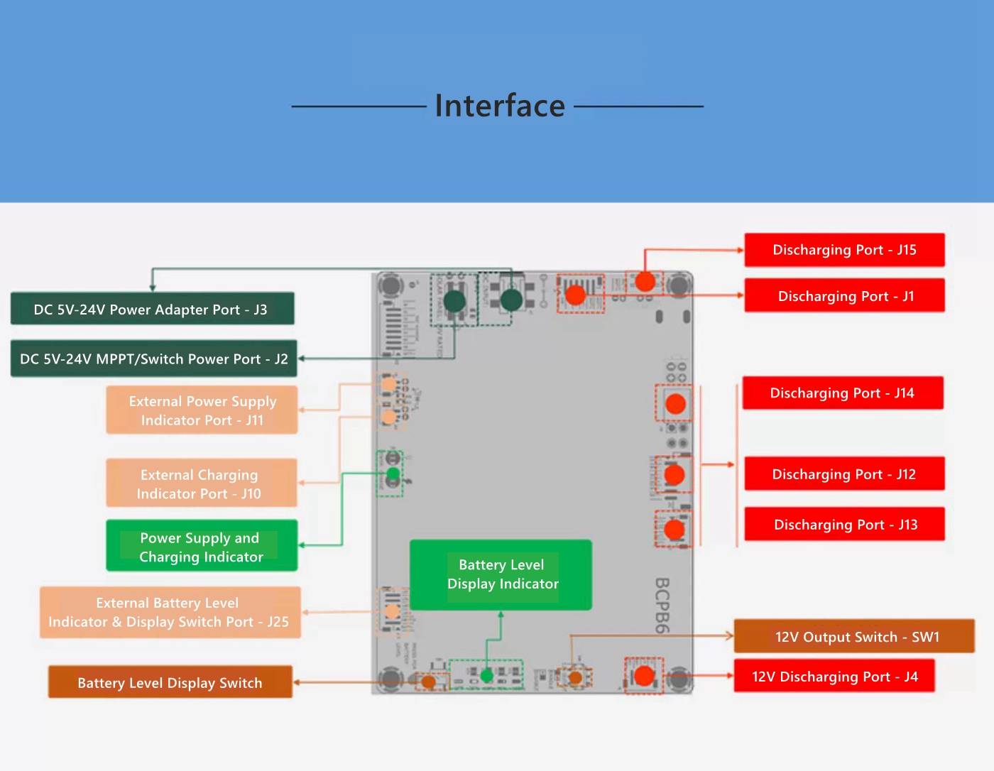 - BCPB6 is complemented with a visualized display of battery level indicators. To ensure the reliability of this board, it is equipped with full protection circuit; overcurrent, over-temperature, short circuit, and over/under voltage protection.