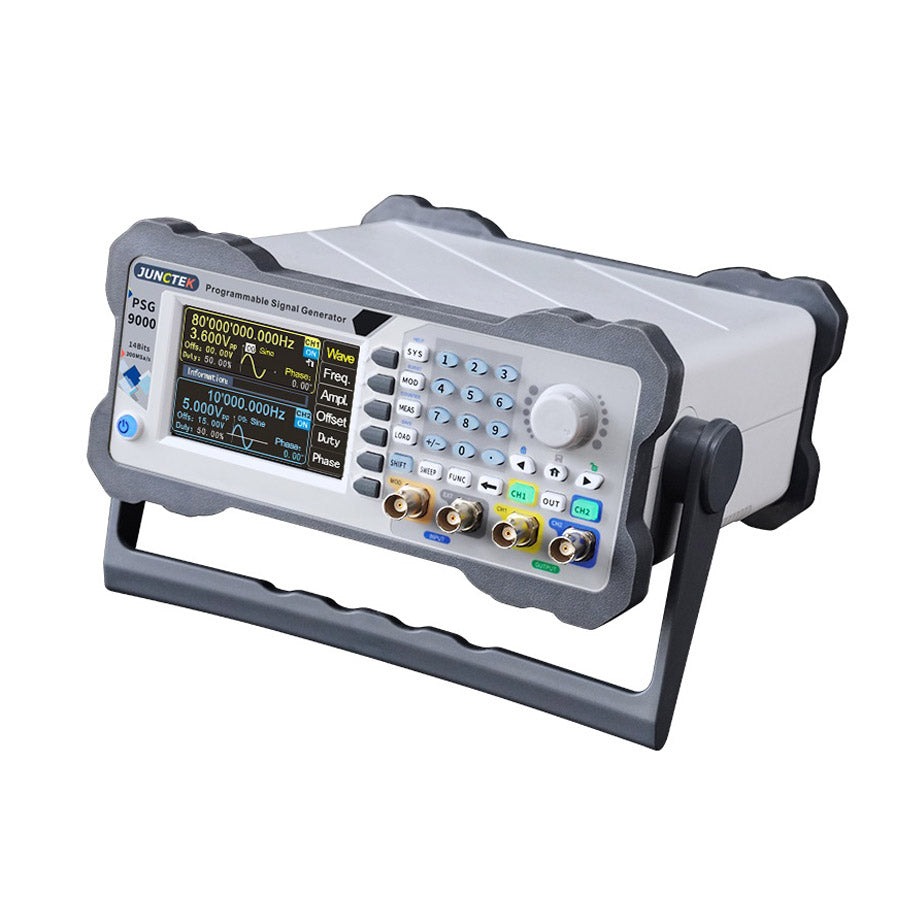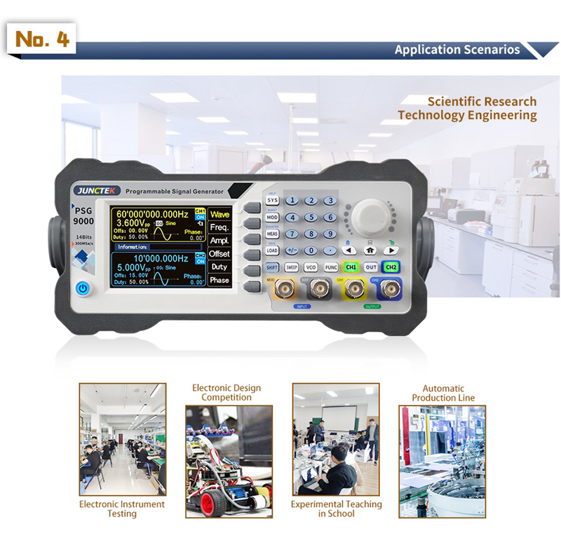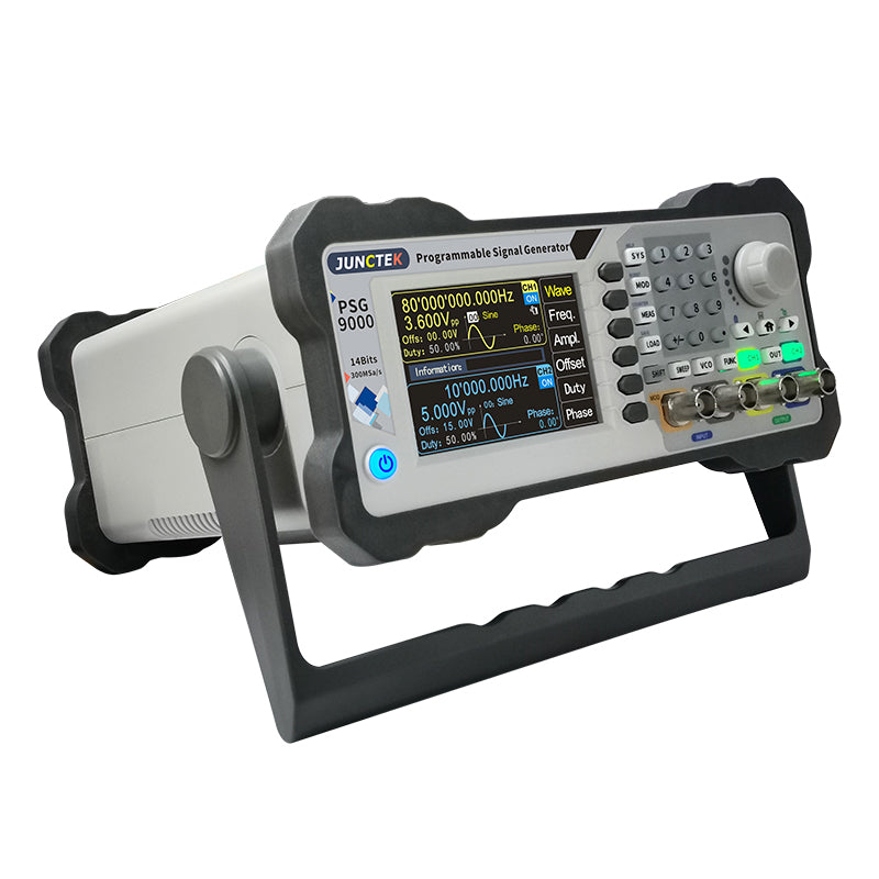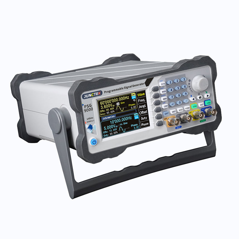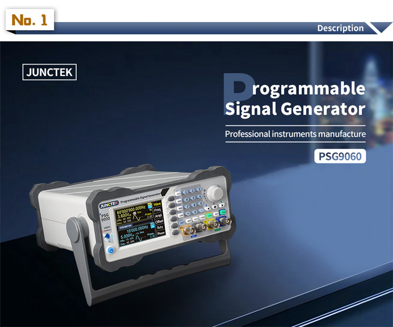 PSG9060 is the programmable function/arbitrary wave signal generator. It can output sine wave, square wave, triangle wave, pulse wave, and arbitrary wave, etc. The frequency range of the instrument is up to 60MHz, With Waveform modulation, frequency sweep, vco, measurement signal frequency and programming functions, etc. It can simultaneously display the output signals, amplitude, phase, duty cycle and frequency. Provide new options for education, research and development, production, testing and other industries.