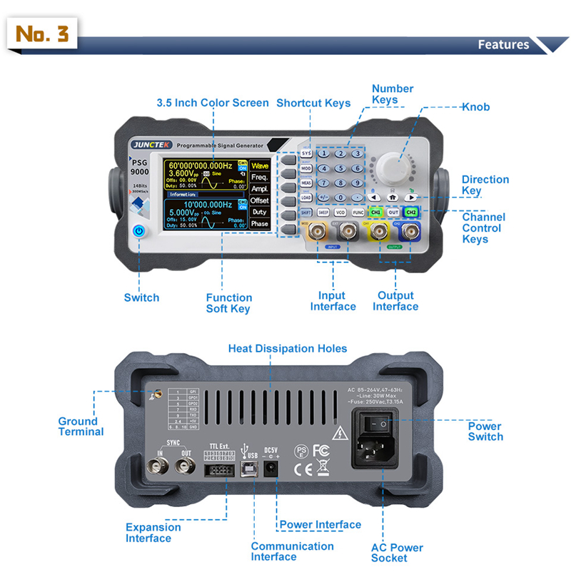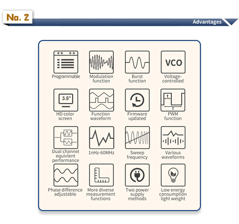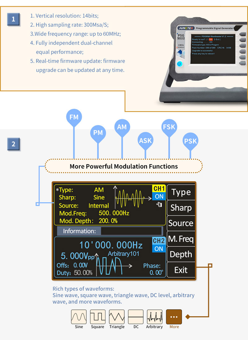 1. Equivalent performance dual channel, Output sine wave frequency range 0-60M, Sampling rate: 300MSa/s. Vertical resolution: 14bits, Support firmware update;