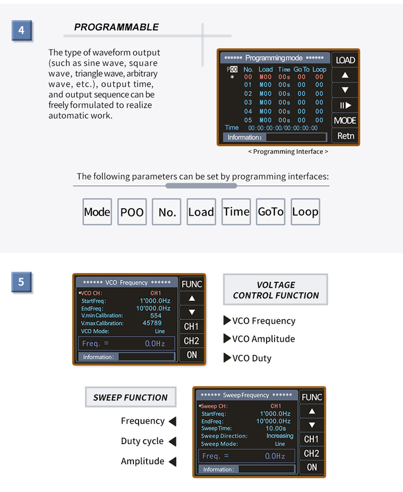6. VCO voltage control scanning function: frequency control, amplitude control, duty control;