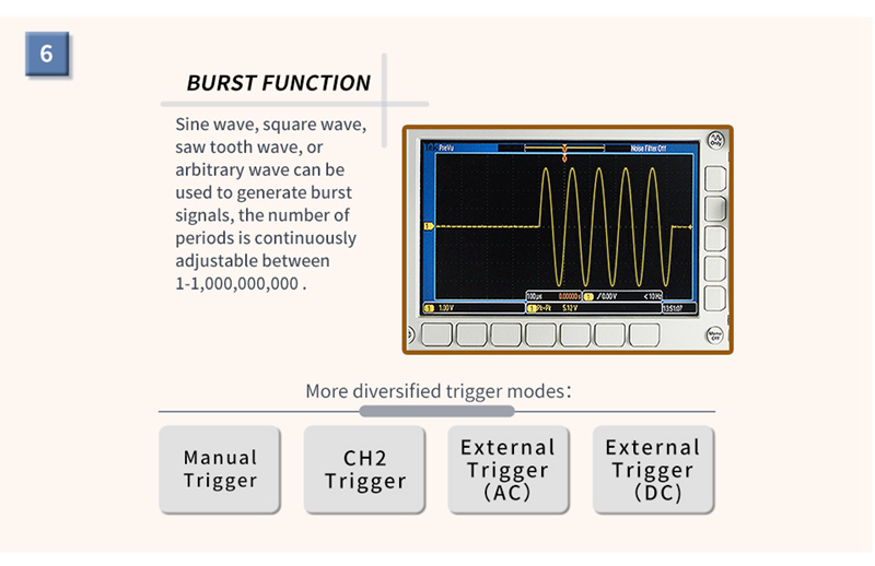 - Trigger source: Manual burst, CH2 burst, external burst (AC), external burst (DC)