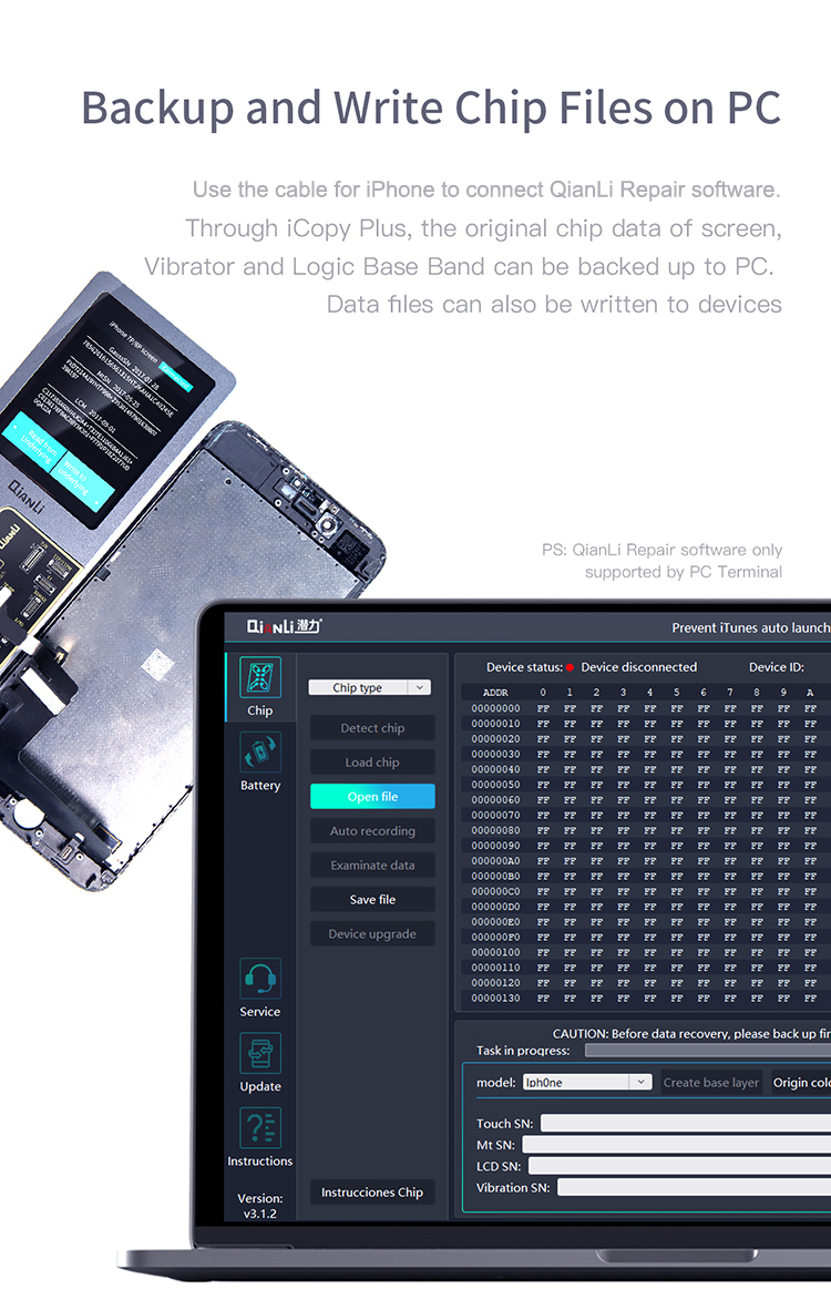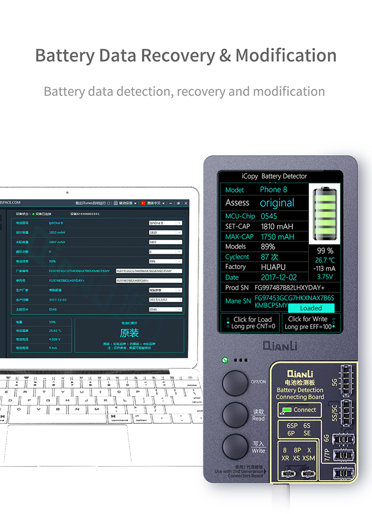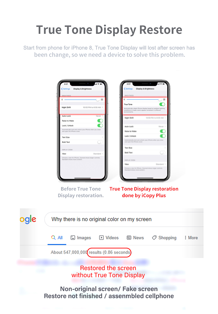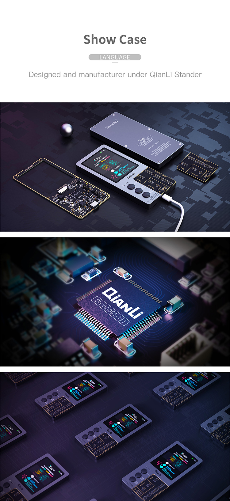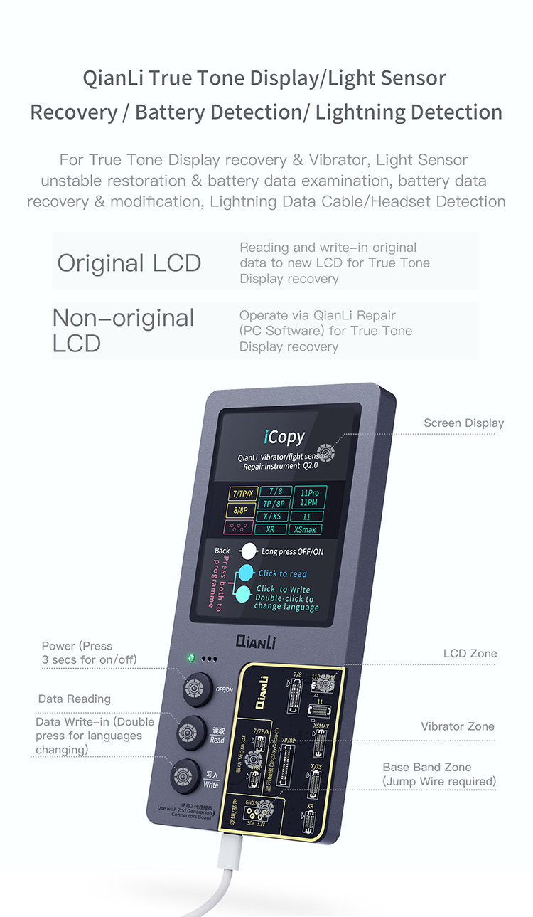 - QianLi True Tone Display/Light Sensor Recovery: For Original LCD: Reading and write-in original data to new LCD for True Tone Display recovery; For Non-original LCD: Operate via QianLi Repair (PC Software) for True Tone Display recovery
