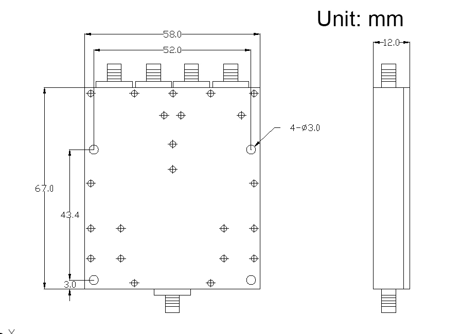 The 4-way RF Power Splitter is used in the range of 500-6000M (0.5-6G). With low insertion loss and high isolation, it is widely used in typical transceiver systems of L, S, and C bands. Typical frequencies: 1575MHz, 2.4GHz, 3.5GHz, 5.8GHz, etc. Using CNC structure cavity, the module has excellent electromagnetic shielding performance.