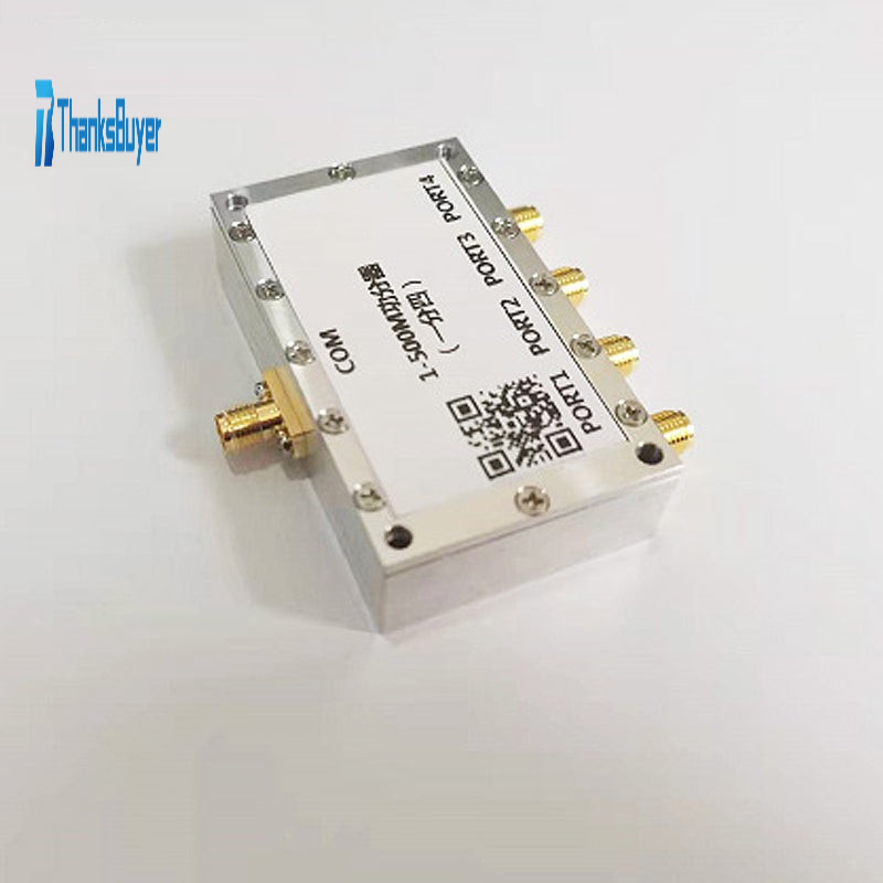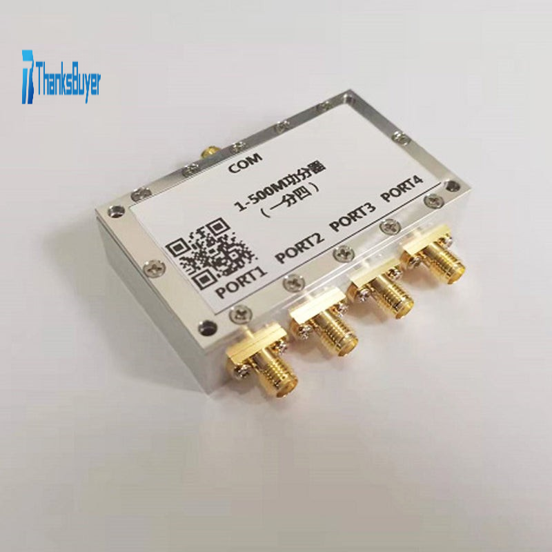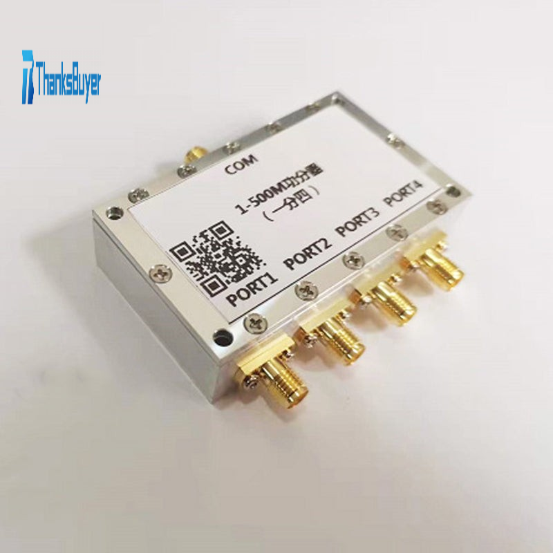 A power divider is a device that divides the energy of one input signal into two or multiple channels to output equal or unequal energy, and can also combine the energy of multiple signals into one output in turn, which can also be called a combiner. This module realizes power quartering, used in the frequency range of 1-500M, and its low-end frequency can reach 500KHz. With low insertion loss and high isolation, it is widely used in typical transceiver systems below 500M. The module adopts CNC structure cavity, which has excellent electromagnetic shielding performance.