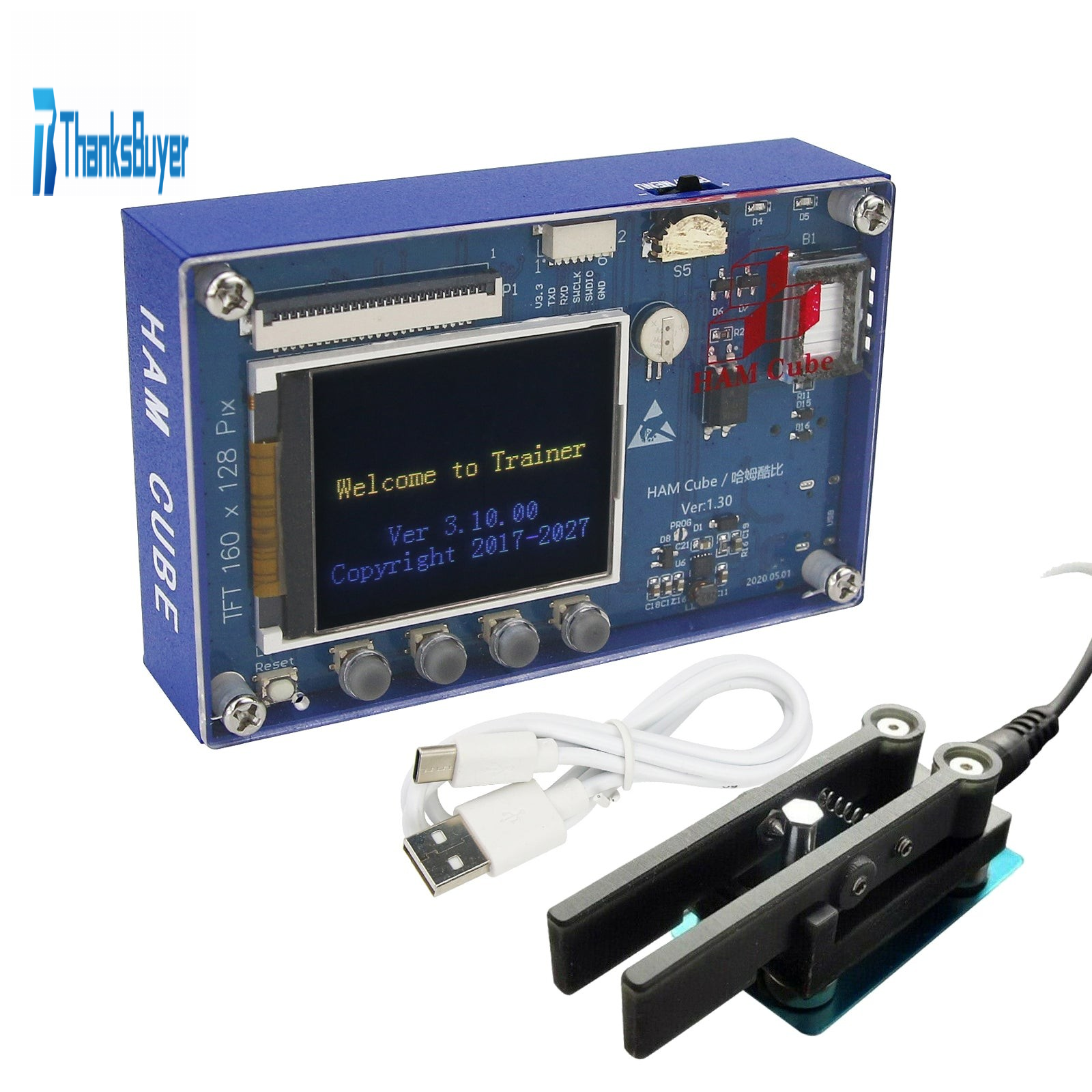 The core of the CW trainer is a 32-bit ARM-STM32F103CBT6. The chip has 128k of FLASH space and 20k of RAM space, and the working frequency is 72M. A 1.8-inch 160*128 resolution is installed on the front of the main control board. 16-bit true color TFT-LCD liquid crystal display, as the display device of the main controller. The board is designed with 4 touch buttons, a three-way toggle switch, a system hardware reset button and a power supply repair pad jumper; There are 2 user-programmable LED indicators (D2, D3); the external function interface with up to 24 pins leads out as many MCU pins as possible for external use and function expansion; the reset button is located on the lower left of the front of the device Angle, the main control board can be reset by hardware by pressing the fine needle; the 6P programming interface can be used to connect professional embedded development equipment, and carry out secondary development and programming of the internal MCU.