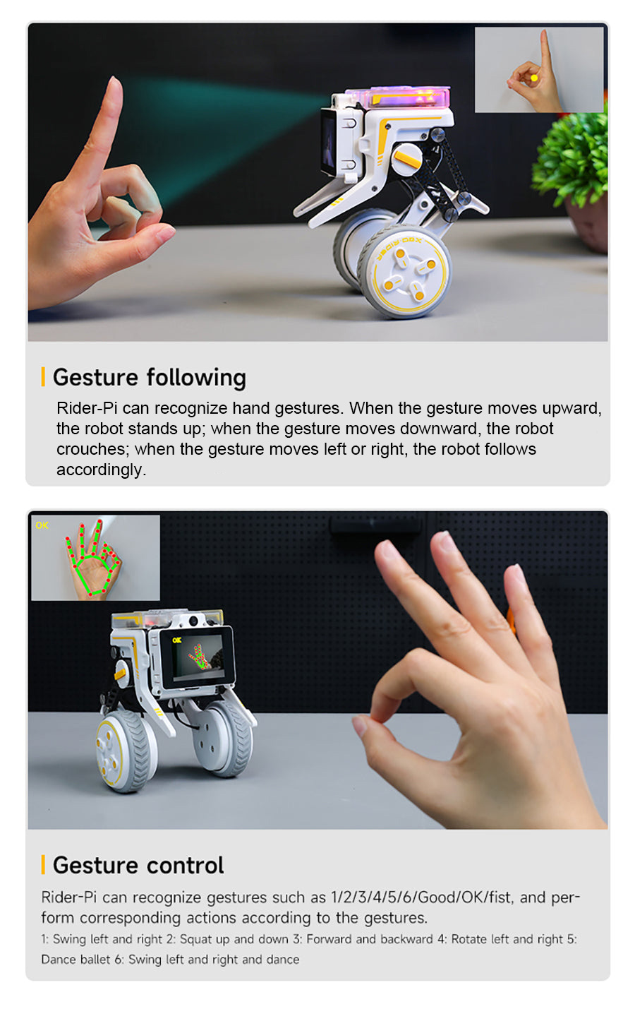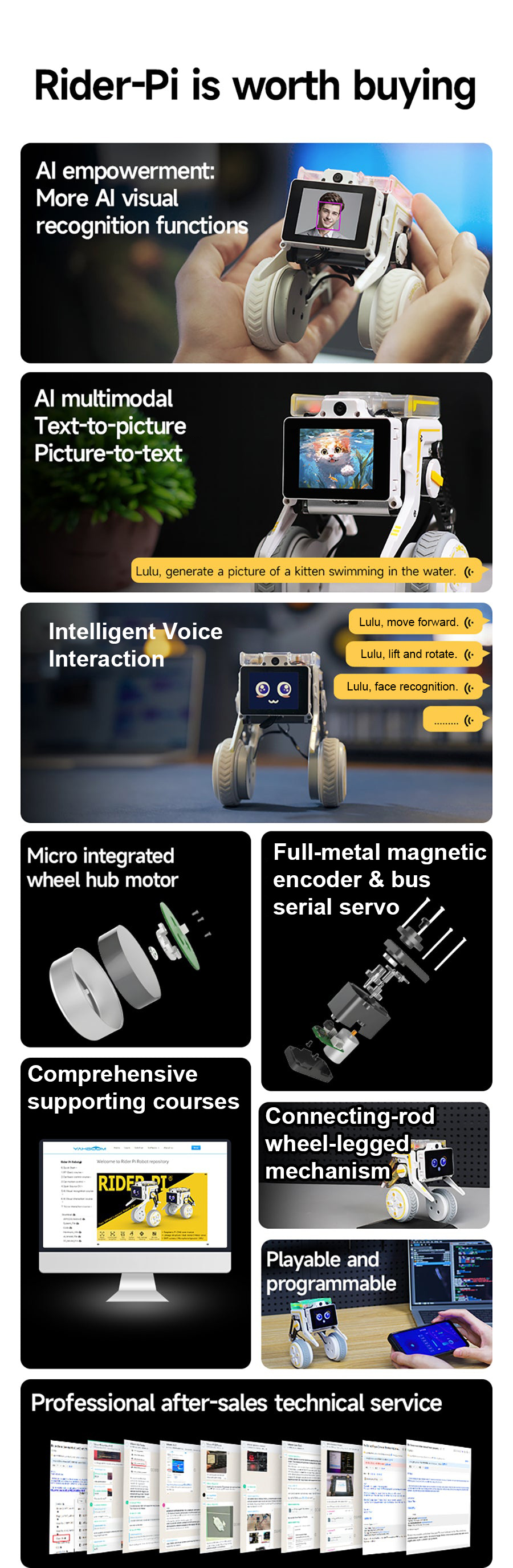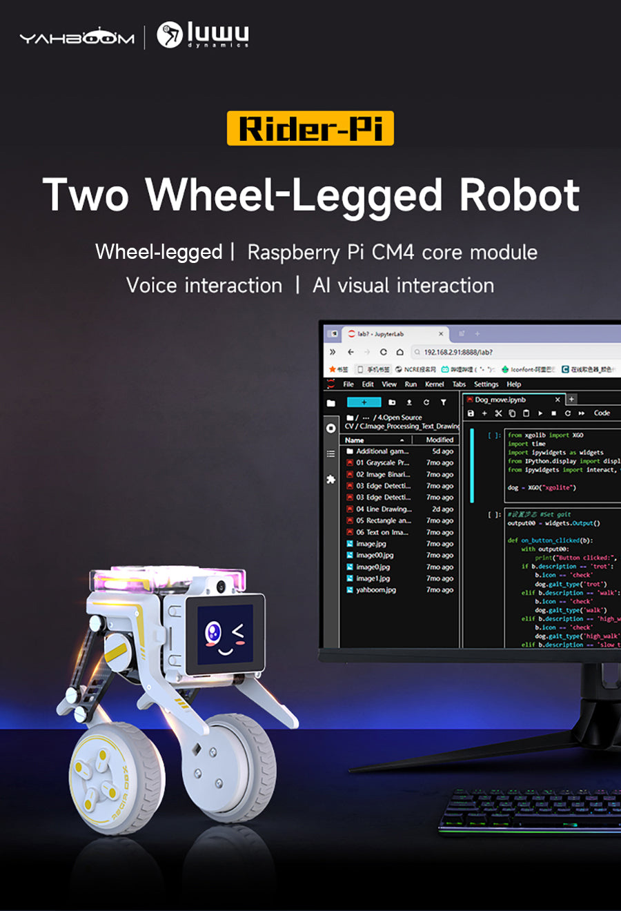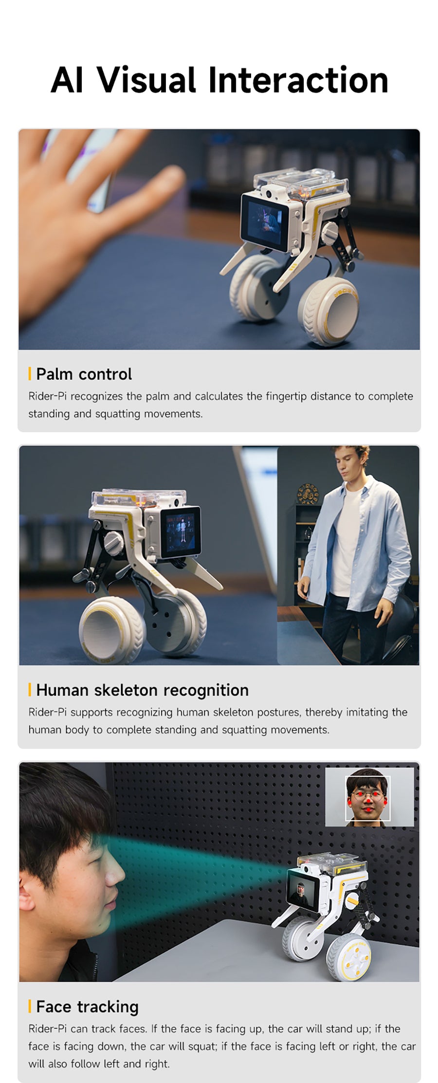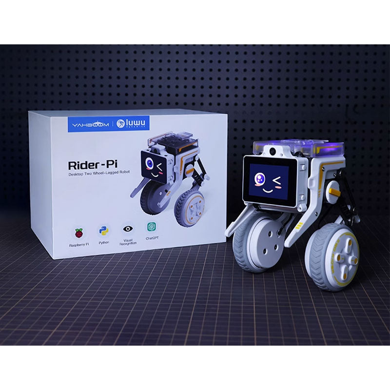 Rider-Pi is a desktop-level wheel-legged robot. It features a built-in inertial measurement unit (IMU), allowing real-time joint angle adjustment to adapt to various terrains and obstacles. Based on the Raspberry Pi CM4 module and programmed in Python, it supports a wide range of AI functions, including face recognition, color tracking/following, QR code-based motion control, object detection, license plate recognition, and gesture following.