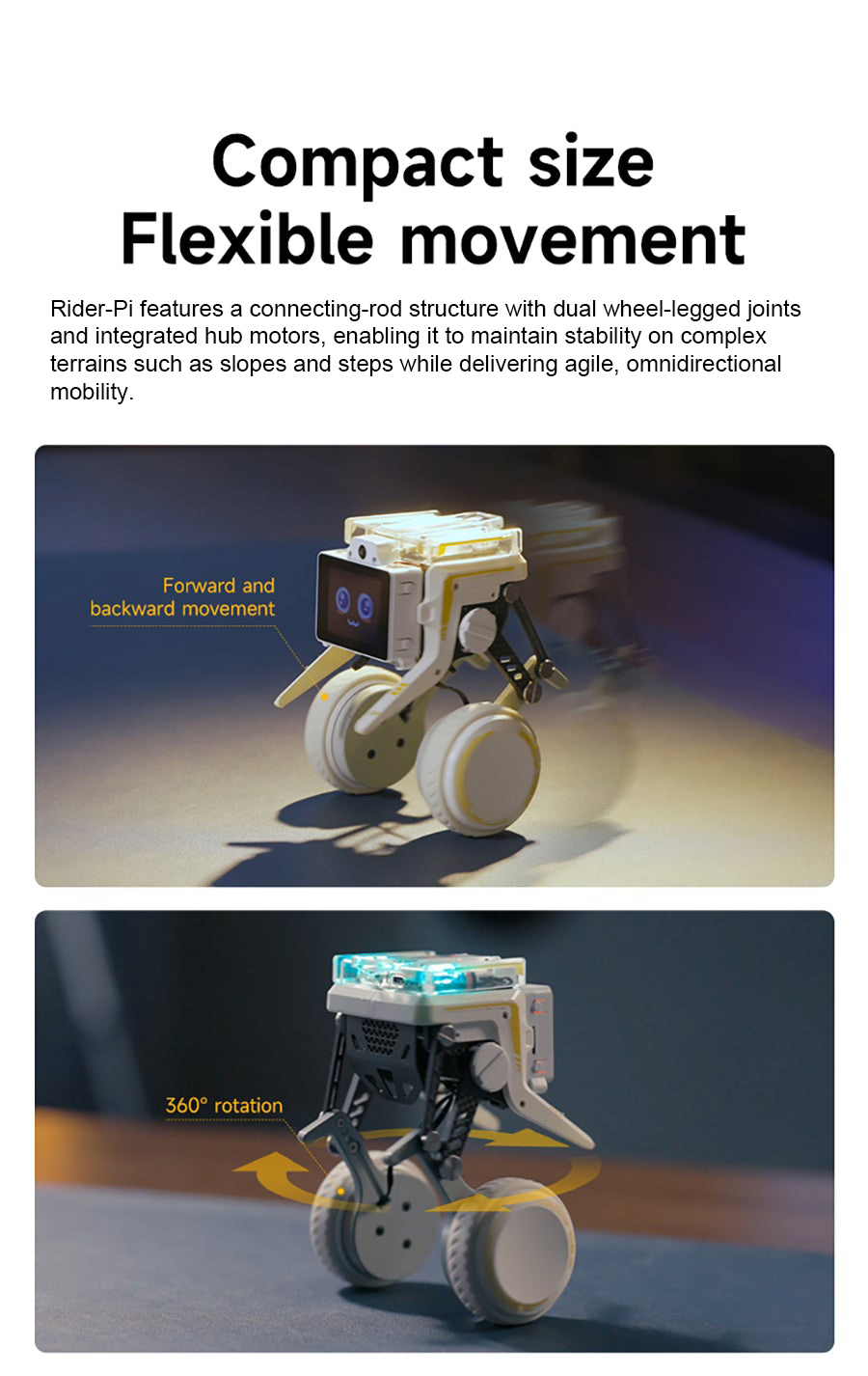 * Dual Wheel-Leg Joints and Linkage Structure: Rider-Pi uses a dual wheel-leg joint design, integrating the motor and wheel as one unit. The linkage-style wheel-leg structure enables the robot to move smoothly over various terrains, combining the maneuverability of wheeled robots with the obstacle-crossing ability of legged robots.
