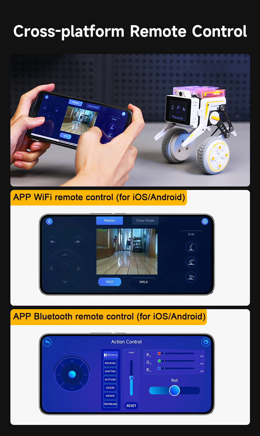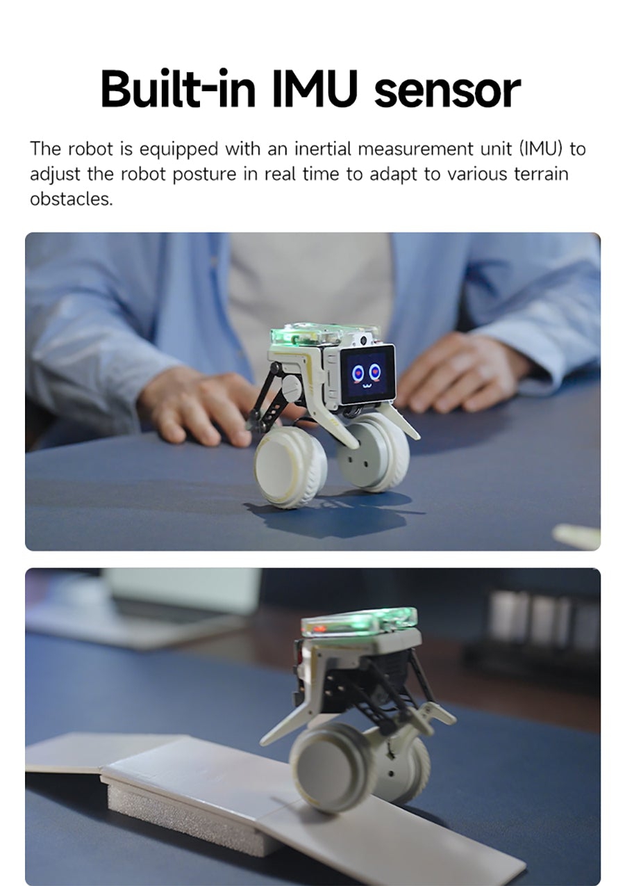 * Featuring a high-precision IMU module and a connecting-rod bipedal structure, it combines the mobility of wheeled robots with the obstacle-crossing ability of legged robots.