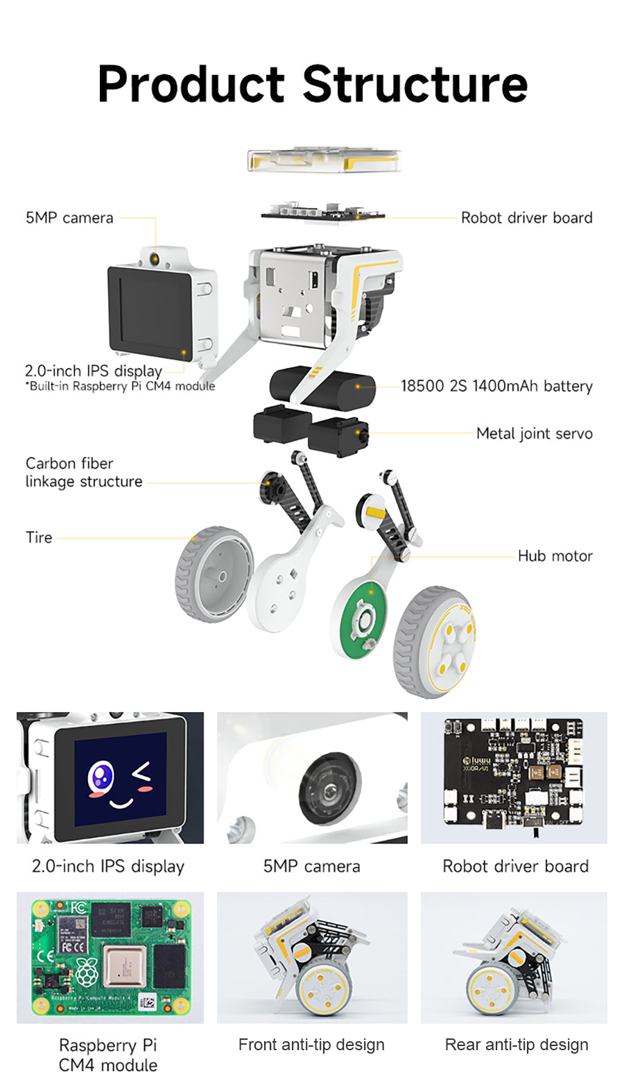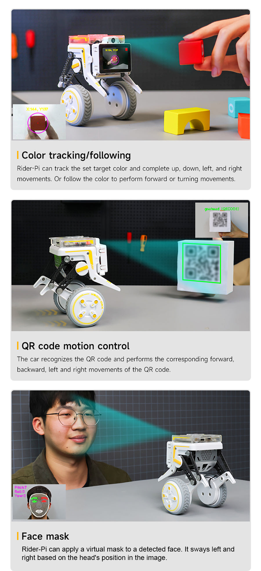* Integrated Raspberry Pi CM4 Module: Rider-Pi is equipped with a built-in AI module based on the Raspberry Pi CM4 architecture. It features a 2.0-inch IPS color display, four programmable buttons, a 5MP camera, two digital microphones, and a speaker. With excellent visual and voice interaction capabilities, it supports functions such as image recognition, face detection, and voice conversation.