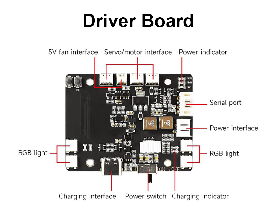 * Drive Board: The main drive board is developed based on ESP32, specially designed for Rider-Pi. It supports a voltage input range of 7.2-8.4V and can continuously provide a 5V/5A power output to meet the power needs of peripheral circuits and user-connected external circuits. The board integrates serial communication circuits at two voltage levels: 5V and 3.3V, facilitating serial communication with other external devices. To support personal users in secondary development, the hardware provides three control signal interfaces, which can connect to serial servos, permanent magnet synchronous motors, and cooling fans, meeting users' development requirements.