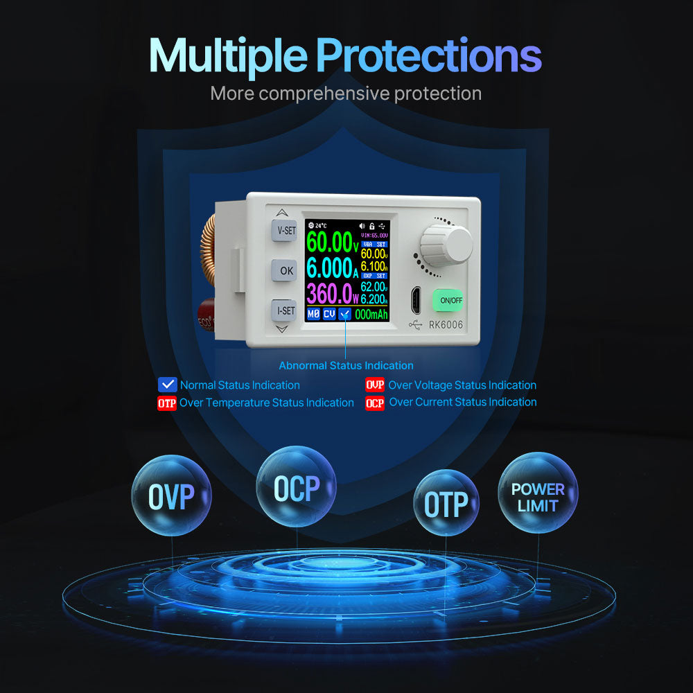 - Supports over-voltage protection, over-current protection and over-temperature protection to protect your loads and the device